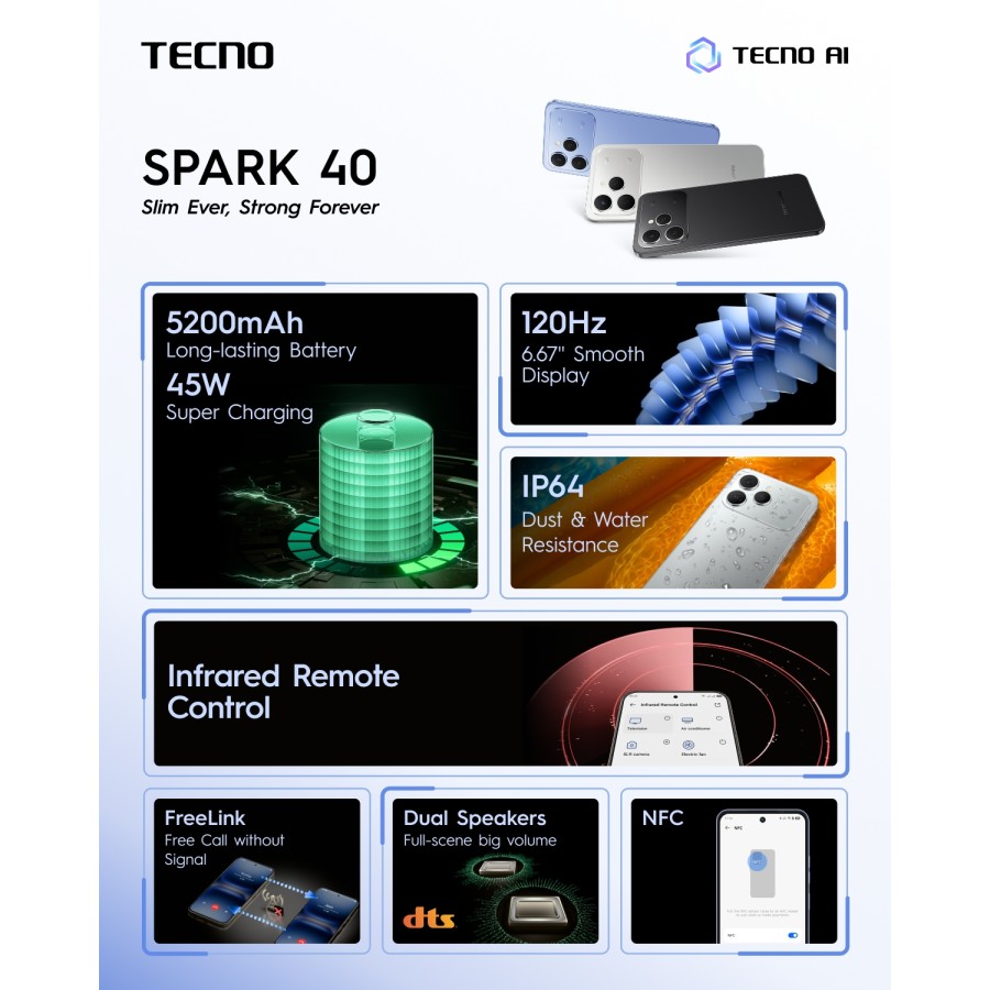 TECNO Spark 40 оснащений акумулятором на 5200 мА·год із підтримкою Super Charging 45 Вт. Він витримує понад 2000 циклів заряджання й навіть через 5 років зберігає понад 80 % ресурсу.