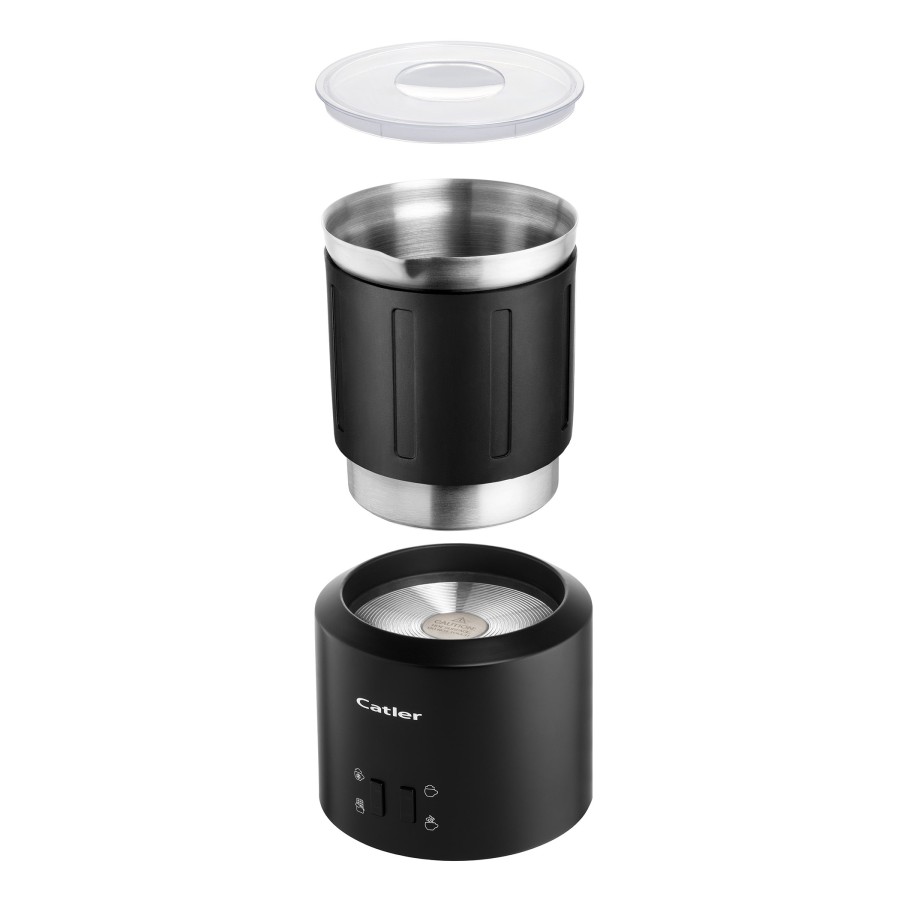 Catler MF621 — преміальний спінювач молока з алюмінієвим корпусом у глибокому матово-чорному кольорі, який виглядає дорого і стильно поруч із будь-якою кавомашиною. Внутрішня ємність має якісне антипригарне покриття, тому молоко не пригорає навіть при приготуванні густого гарячого шоколаду.