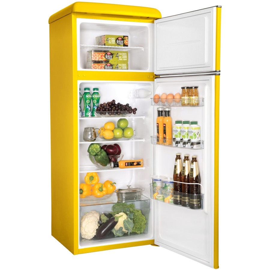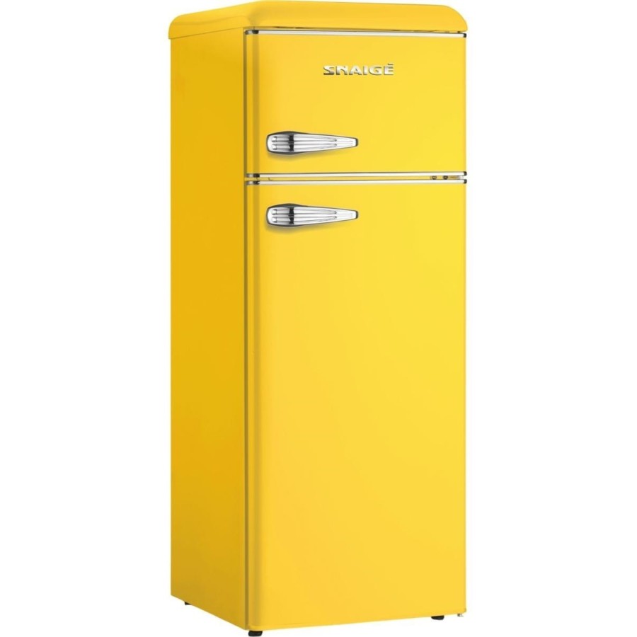 Холодильник Snaige FR24SM-PRDH0E — це поєднання класичного ретро-стилю та сучасних технічних рішень. Модель є окремостоячою, оснащена верхньою морозильною камерою та виконана в яскравому жовтому кольорі з декоративними дверними планками зі срібною гальванічною металізацією. Корисний об’єм холодильника становить 209 л, з яких 162 л припадає на відділення для свіжих продуктів і 47 л — на 4-зіркову морозильну камеру.