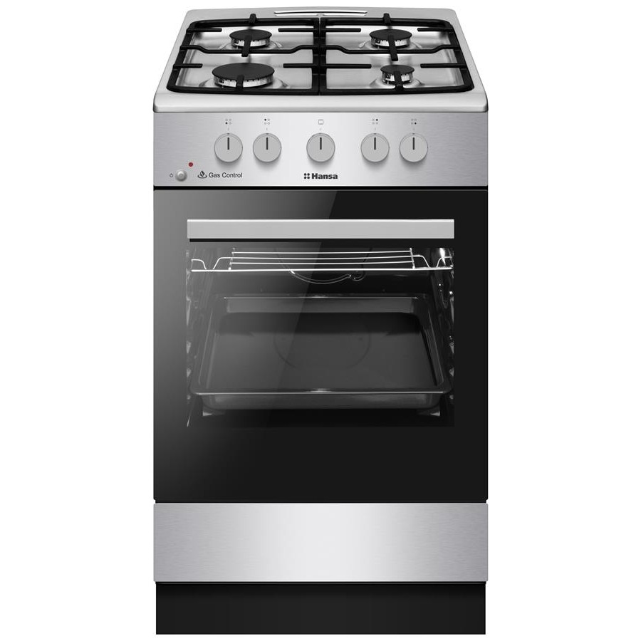 Hansa FCGX52029H — газова плита зі стриманим дизайном у нержавіючому виконанні та місткою духовкою на 67 літрів. Модель має чотири газові конфорки з різною потужністю, чавунні опори та ручне керування. Духовка оснащена статичним нагріванням і грилем 2000 Вт, що забезпечує стабільні умови для приготування. Дверцята з плаваючим склом та внутрішніми рецептами Amica утворюють зручний простір для експлуатації. Галогенна лампа створює яскраве внутрішнє освітлення навіть за низького енергоспоживання.