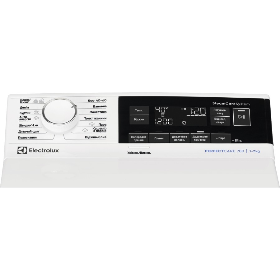 Вертикальна пральна машина Electrolux EW7T3372U створена для дбайливого та ефективного догляду за речами у компактному форматі. Пара з системи SteamCare подається наприкінці прання, волокна розслаблюються і кількість складок зменшується, що спрощує подальший догляд. SensiCare зважує завантаження і коригує тривалість, температуру та витрату води, щоб уникнути надмірної обробки тканин.