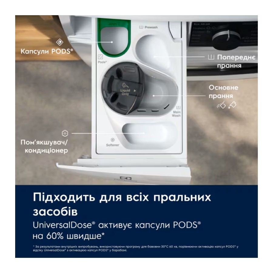 - UniversalDose для всіх типів мийних засобів, швидша активація PODS і чистий лоток завдяки вихровому потоку