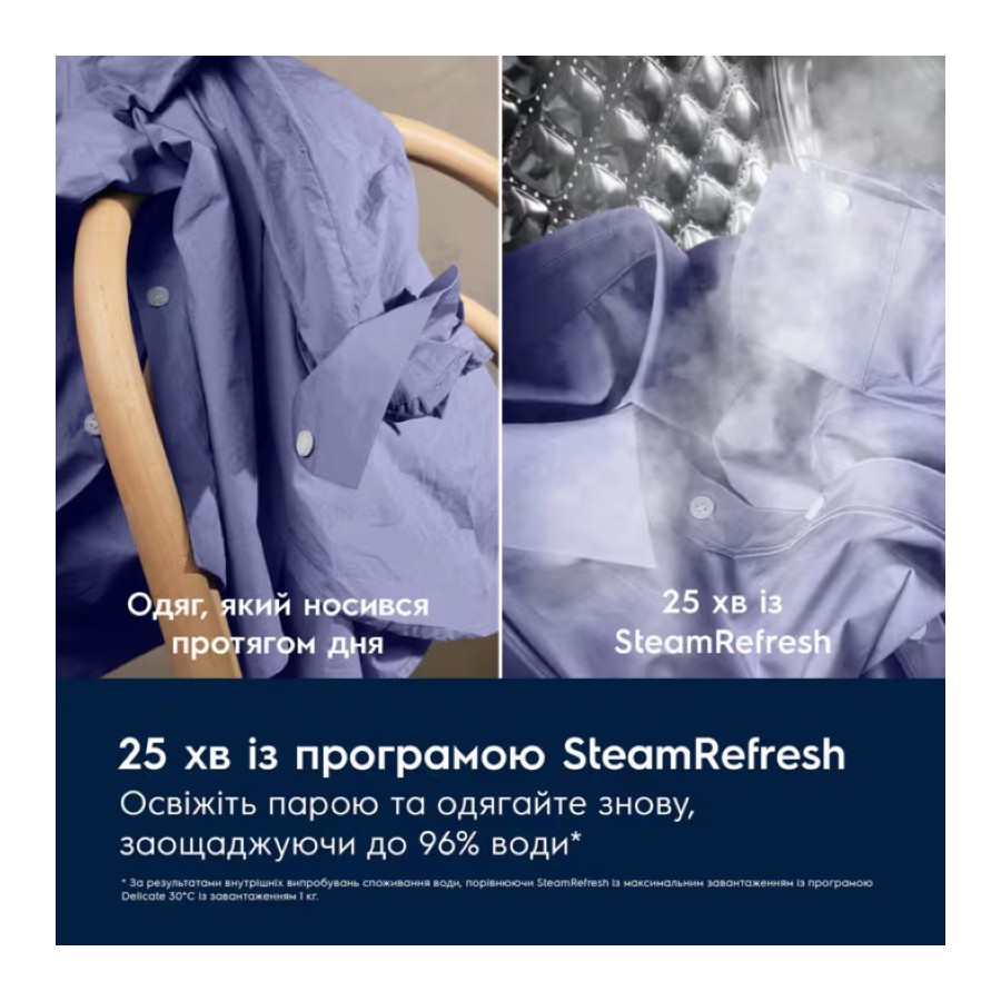 Прально-сушильна машина Electrolux EW7W4602QU об’єднує прання, сушіння та парове оновлення, що дає змогу ефективно доглядати за гардеробом без використання окремих приладів. Програма SteamRefresh освіжає речі приблизно за 25 хвилин із помітним скороченням витрати води порівняно зі стандартним делікатним циклом, допомагає зменшити зминання тканин і усунути сторонні запахи. Це зручно для сорочок, офісного одягу та речей, які потрібно швидко підготувати до використання.