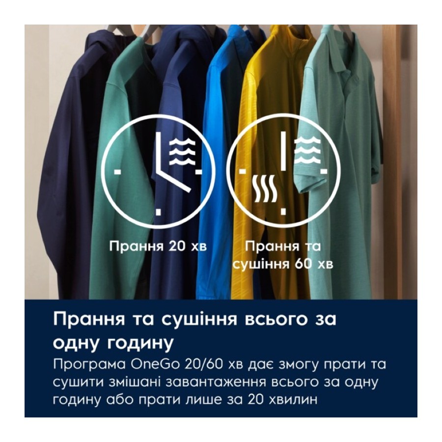 Режим OneGo 20/60 хв розрахований на невеликі змішані завантаження в умовах обмеженого часу. Передбачена можливість короткого циклу прання приблизно за 20 хвилин або повного циклу прання з подальшим сушінням за одну годину. Система полоскання без надмірної піни підтримує коректну роботу, а захист від переливання води підвищує безпеку та надійність експлуатації у щоденних умовах.