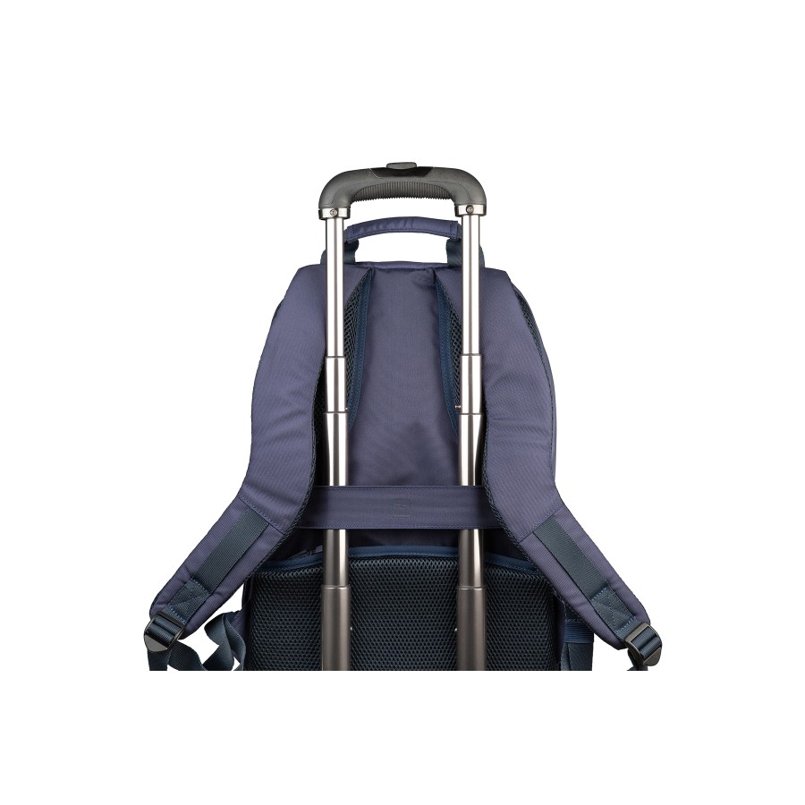 Наступне відділення для документів А4, книг і зошитів. На фронтальній стороні є невелика кишеня для аксесуарів. Зі зворотнього боку розміщені регульовані плечові лямки і ремінь для кріплення до телескопічної ручки валізи і прихована кишеня на блискавці. Збоку у рюкзаку є дві зручні кишені для парасольки та пляшки з водою.