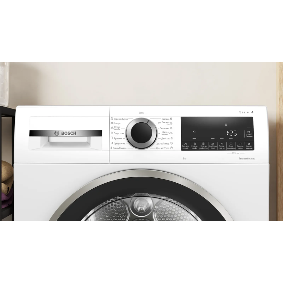 Bosch WQG14210UA — сушильна машина з тепловим насосом і місткістю до 9 кг, створена для ефективного та дбайливого догляду за білизною. Технологія AutoDry автоматично визначає оптимальний момент завершення сушіння: сенсори відстежують температуру та рівень вологості, запобігаючи перегріванню чи пересушуванню тканин. Система SensitiveDrying забезпечує м’який потік теплого повітря з усіх боків барабана; вигнуті лопатки допомагають уникнути зминання. Функція Антизминання після завершення програми делікатно розпушує білизну, зменшуючи потребу у прасуванні. Швидка програма Супер 40 висушує невеликі обсяги синтетичних і тонких тканин за короткий час. Є спеціальні режими для спортивного одягу, пухових речей, а також опція половинного завантаження — для економії часу та електроенергії. Індикатор залишкового часу допомагає точно планувати побутові справи. Технологія теплового насоса сприяє помірному споживанню електроенергії.