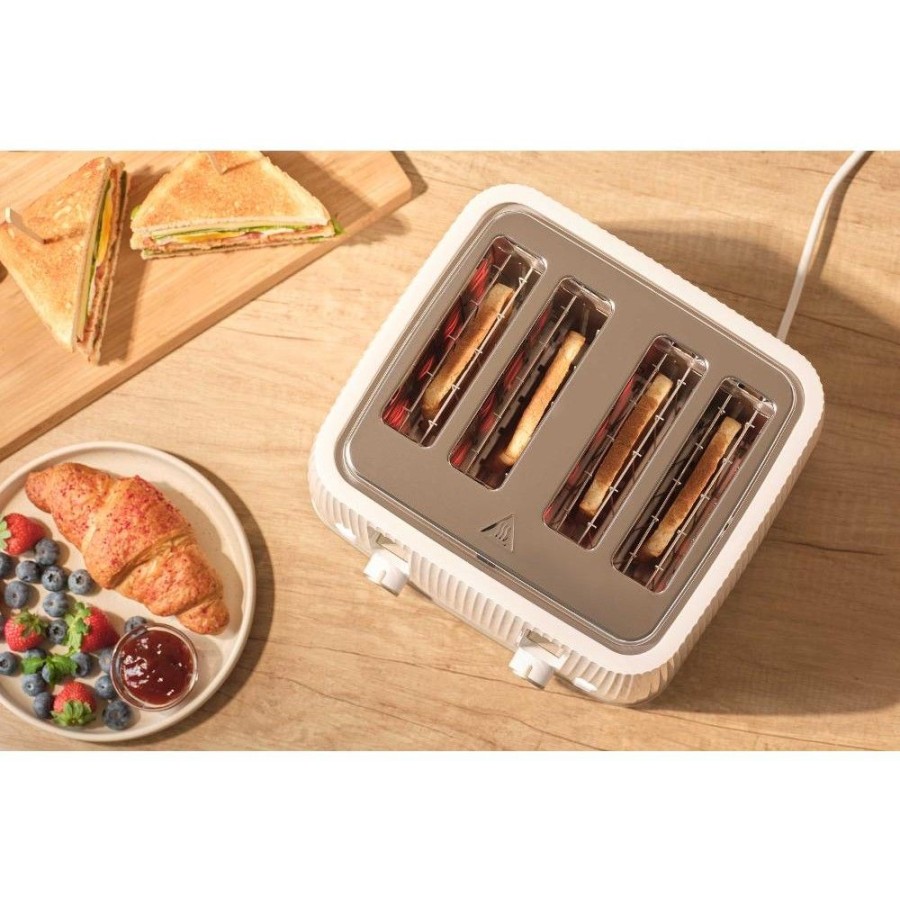Три основні функції: розморожування (для замороженого хліба), підігрів (без додаткового підсмажування) та миттєва зупинка (Cancel) — усі з підсвічуванням кнопок. Знімна решітка для булочок і круасанів, великий легковидний піддон для крихт та автоматичне центрування хліба. Корпус з термостійкого білого пластику виглядає дуже акуратно і вписується в будь-яку кухню.