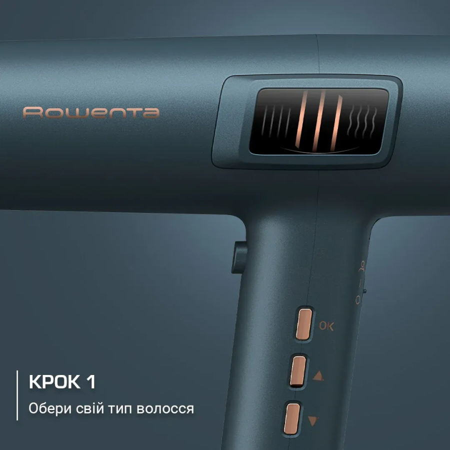 Фен Rowenta Maestria For you розроблений для індивідуального стайлінгу з урахуванням особливостей волосся. Розумна технологія For you дає змогу налаштувати роботу приладу згідно з вашими побажаннями. На екрані можна обрати один із чотирьох типів волосся та один із двох рівнів густоти, після чого фен автоматично пропонує відповідну комбінацію температури, швидкості повітря та рекомендованої насадки. Це спрощує вибір режимів і допомагає зменшити ризик перегріву волосся.