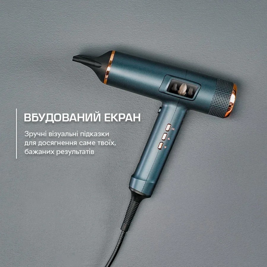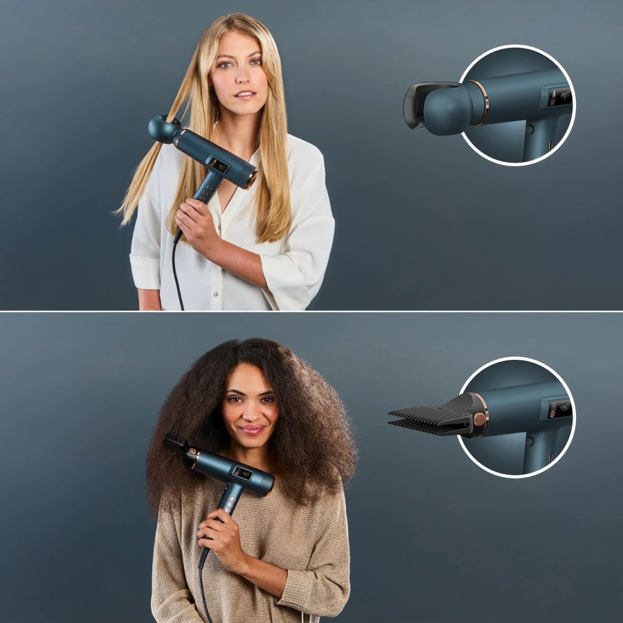 Професійний цифровий мотор NANO Brushless забезпечує стабільний і потужний потік повітря зі швидкістю до 225 км/год, завдяки чому час сушіння зменшується навіть для густого волосся. При цьому фен важить приблизно 330 г, тому його зручно тримати під час тривалого стайлінгу. Іонізація допомагає зменшити статичну електрику та робить волосся більш гладким і слухняним. Режим подачі холодного повітря дає змогу завершити стайлінг прохолодним потоком для фіксації форми. За потреби автоматичний режим можна переключити на ручний і обрати одну з трьох температур та одну з трьох швидкостей повітря. Для зберігання вдома та у поїздках у комплекті передбачений преміальний кейс, у який можна скласти фен разом із насадками.