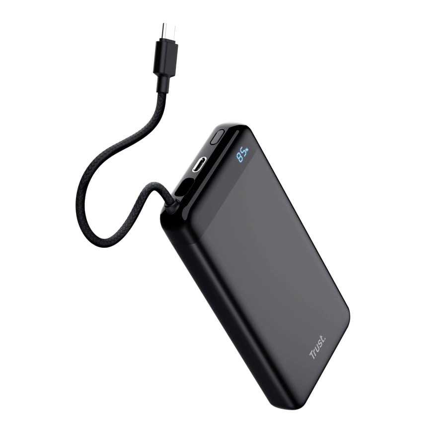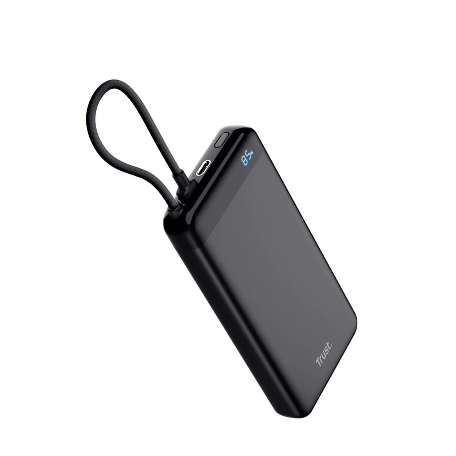 Trust Fiera — це стильний і функціональний зовнішній акумулятор ємністю 20 000 мА·год у міцному алюмінієвому корпусі. Вбудований фіксований кабель USB-C забезпечує швидку зарядку пристроїв до 20 Вт і підзарядку самого power bank до 18 Вт. Додатковий порт USB-C дозволяє заряджати два пристрої одночасно. Світлодіодний дисплей показує точний відсоток заряду (0–100%) та індикатор активної швидкої зарядки PD. Компактні розміри та вага роблять його зручним для кишені чи сумки, а сертифікація для авіаперельотів дозволяє брати його в ручну поклажу.