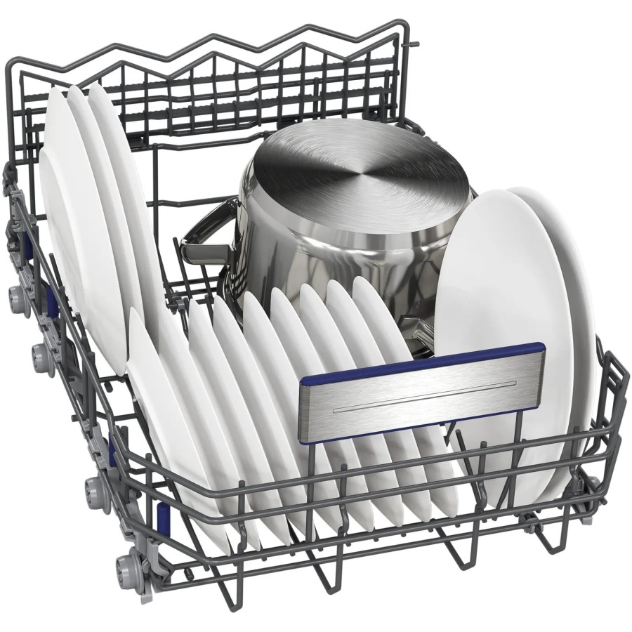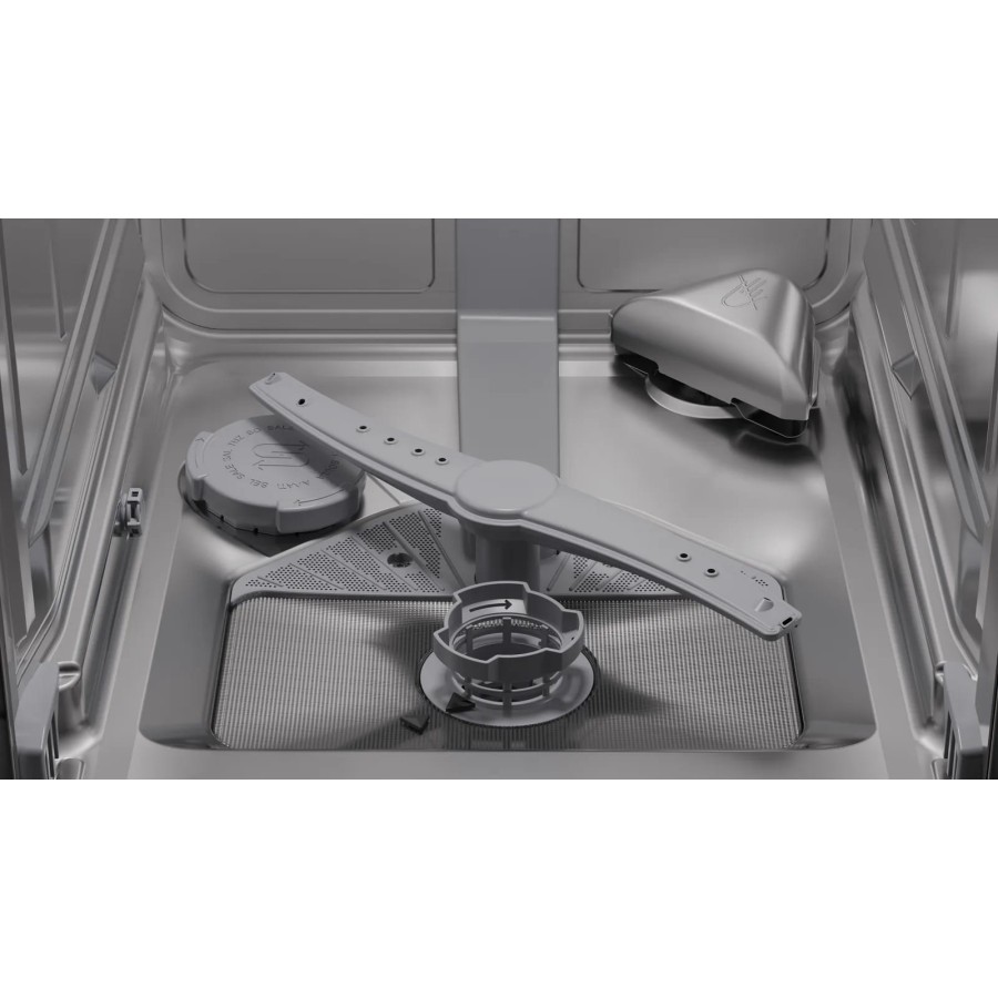 Автоматичне очищення фільтра активується через застосунок Home Connect і виконується вбудованою форсункою після ключових етапів миття, що зменшує потребу у ручному догляді. Функція intensiveZone підвищує тиск подачі води у нижньому кошику для видалення складних забруднень, а подвійне коромисло duoPower допомагає воді рівномірно охоплювати зону миття у верхньому кошику.