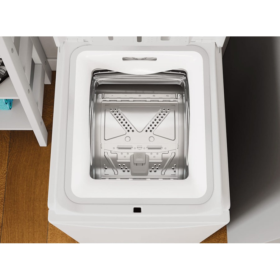Вертикальне завантаження спрощує доступ до барабана та економить простір. Об’єм барабана 42 л підходить для регулярного прання одягу й домашнього текстилю. Програма Turn & Go дозволяє швидко запускати повсякденний цикл без складних налаштувань. Передбачені режими для бавовни, синтетики, вовни та делікатних тканин. Помірне споживання води сприяє раціональному використанню ресурсів.