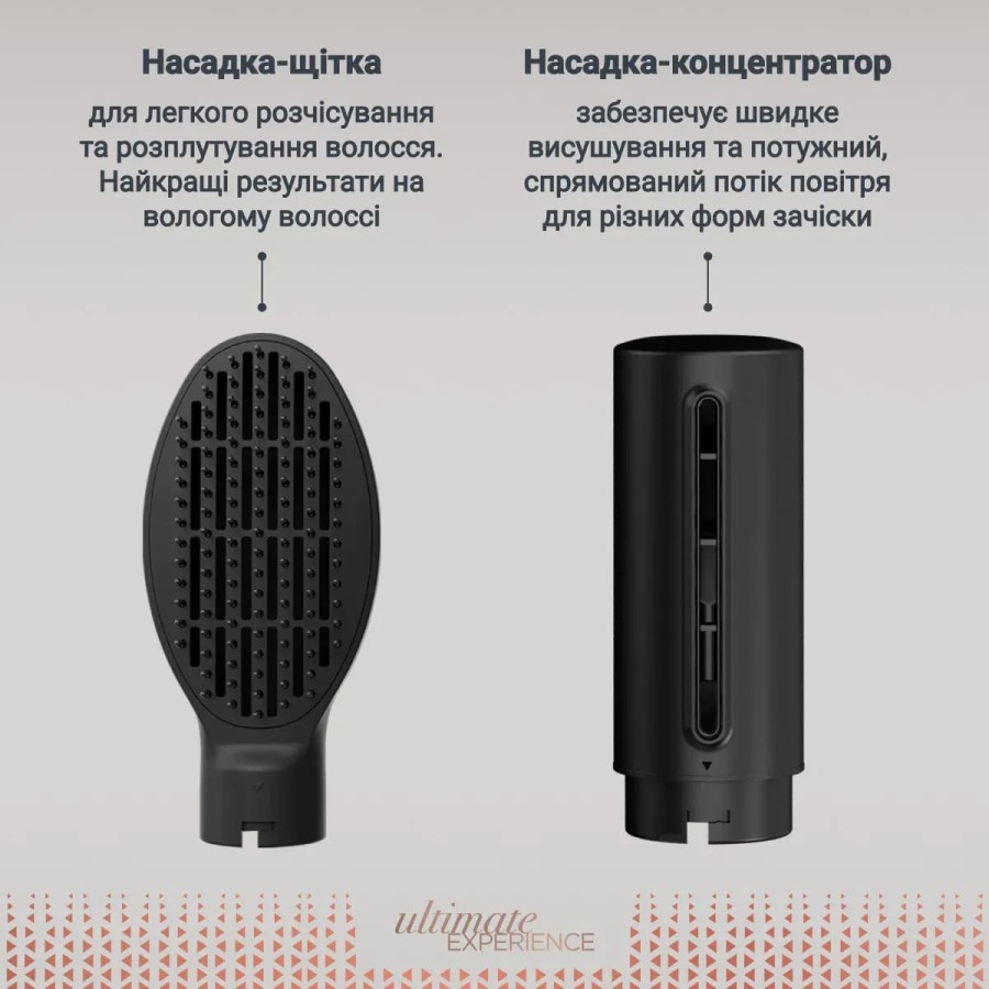Комплект містить чотири насадки, серед яких плоска щітка для розгладження та розплутування, кругла щітка з керамічним покриттям, конусна насадка для хвиль та концентратор для спрямованого повітряного потоку.
