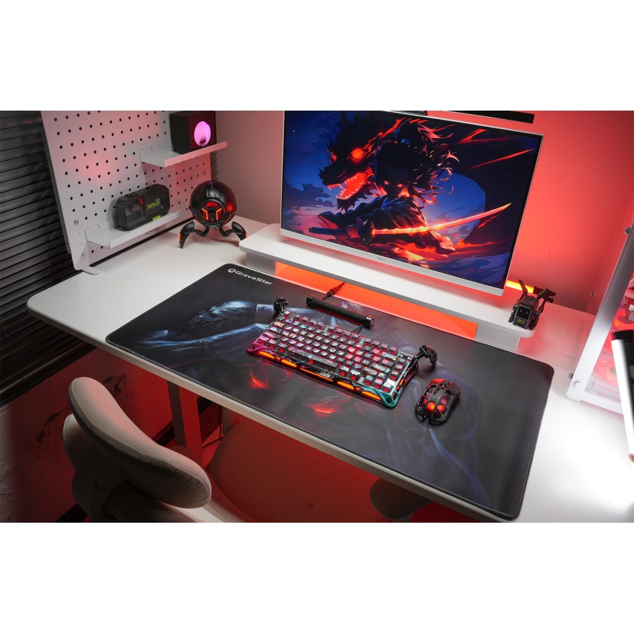 GravaStar WARRIOR XL – це ігрова поверхня з виразним темним оформленням, яка додає робочому столу структурованості та стриманого стилю. Великий розмір килимка дозволяє комфортно розміщувати всю периферію, забезпечуючи вільний рух миші під час активних ігор або роботи. Гладкий матеріал покращує точність сенсора й робить керування передбачуваним. Прошиті краї підсилюють міцність, а нековзка основа гарантує стабільність.
