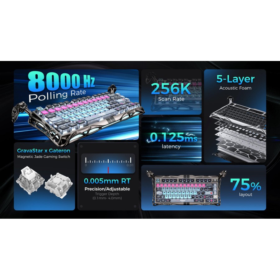 GravaStar Mercury V75 Pro Cyberpunk — це поєднання футуристичного дизайну та високої продуктивності. Модель використовує магнітну технологію Hall Effect, що забезпечує неймовірну точність спрацьовування. Конструкція з металевою рамою вирізняється міцністю, а RGB-підсвічування підкреслює стиль кіберпанк. Кожен натиск стає контрольованим і чітким, навіть у найдинамічніших іграх.