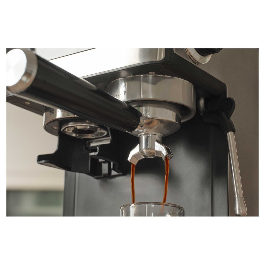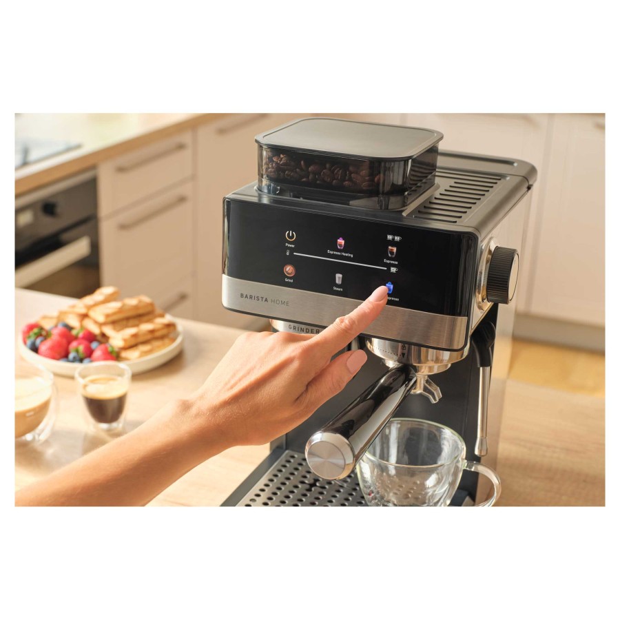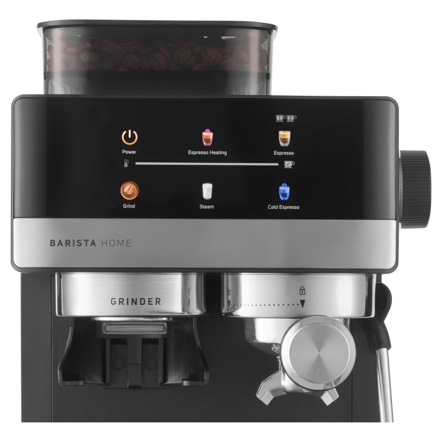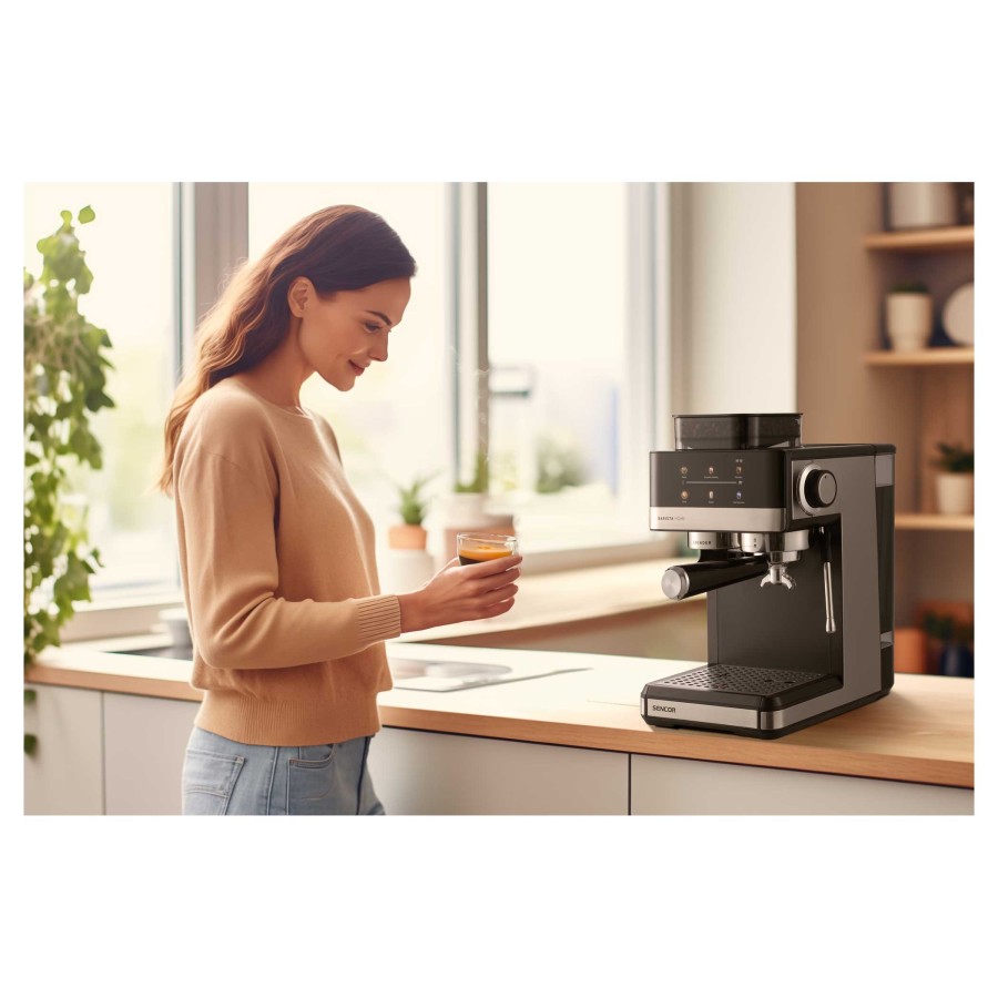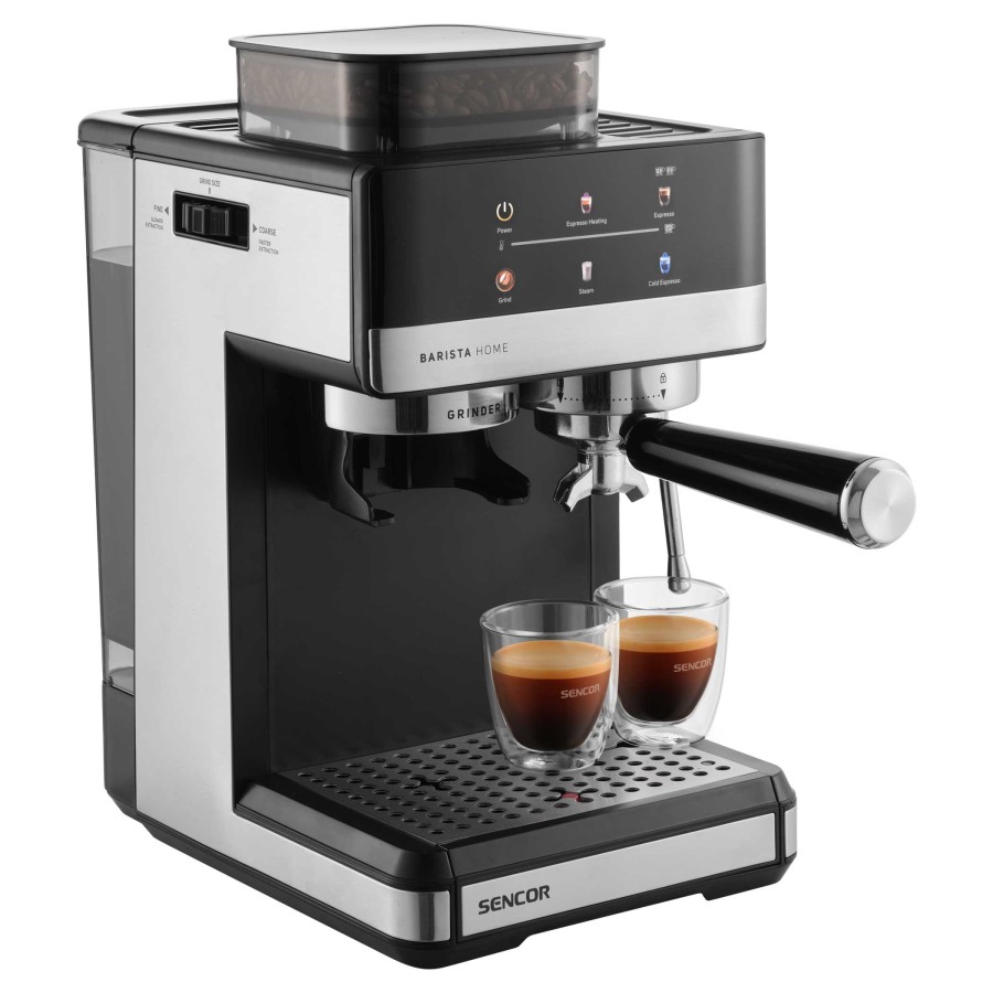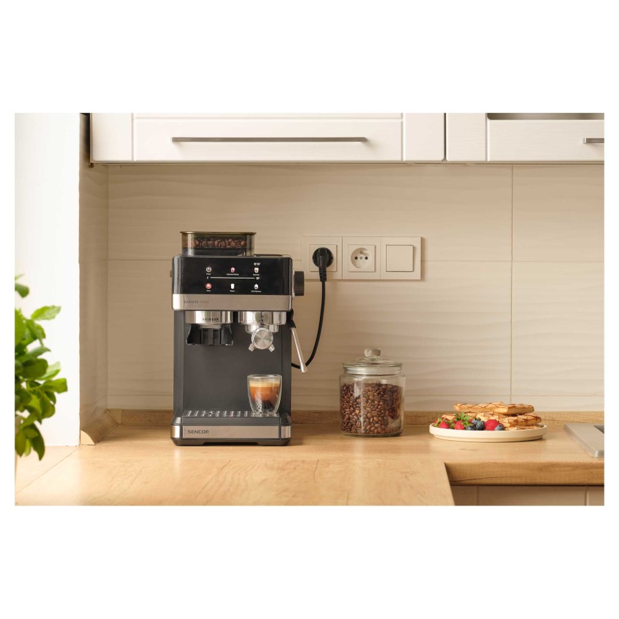 Кавоварка Sencor об’єднує функції еспресо-машини та кавомолки, забезпечуючи приготування кави зі свіжомелених зерен. Вбудована металева кавомолка має 20 ступенів помелу — від дрібного до грубого. Італійський насос із тиском 20 бар створює стабільну екстракцію, а система Thermoblock гарантує швидкий нагрів. Сенсорний кольоровий дисплей з піктограмами робить керування зручним і наочним. Поворотна парова насадка дає змогу спінювати молоко, а функція попереднього заварювання підсилює аромат. Модель обладнана знімним піддоном для крапель, підігрівачем чашок та функцією автоматичного вимкнення.