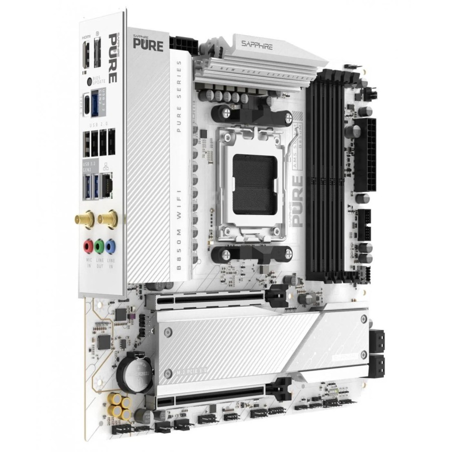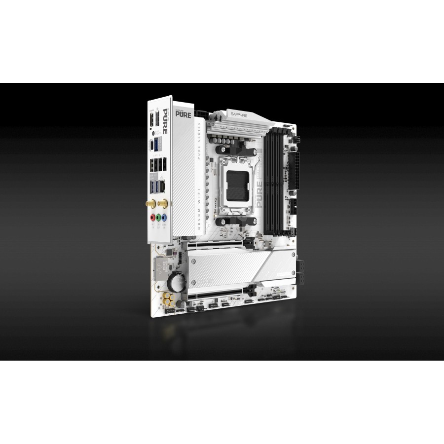 Материнська плата SAPPHIRE PURE B850M WIFI побудована на чипсеті AMD B850 та підтримує процесори Ryzen серій 7000, 8000 і 9000. Чотири слоти DDR5 дозволяють встановити до 256 ГБ оперативної памʼяті з високою частотою роботи. Плата оснащена слотами PCIe 5.0 x16 та двома розʼємами M.2 для швидких накопичувачів. Мережеві можливості включають гігабітний Ethernet і бездротовий модуль WiFi 6 з Bluetooth 5.3. Компактний формат micro-ATX поєднує зручність монтажу та сучасну функціональність.