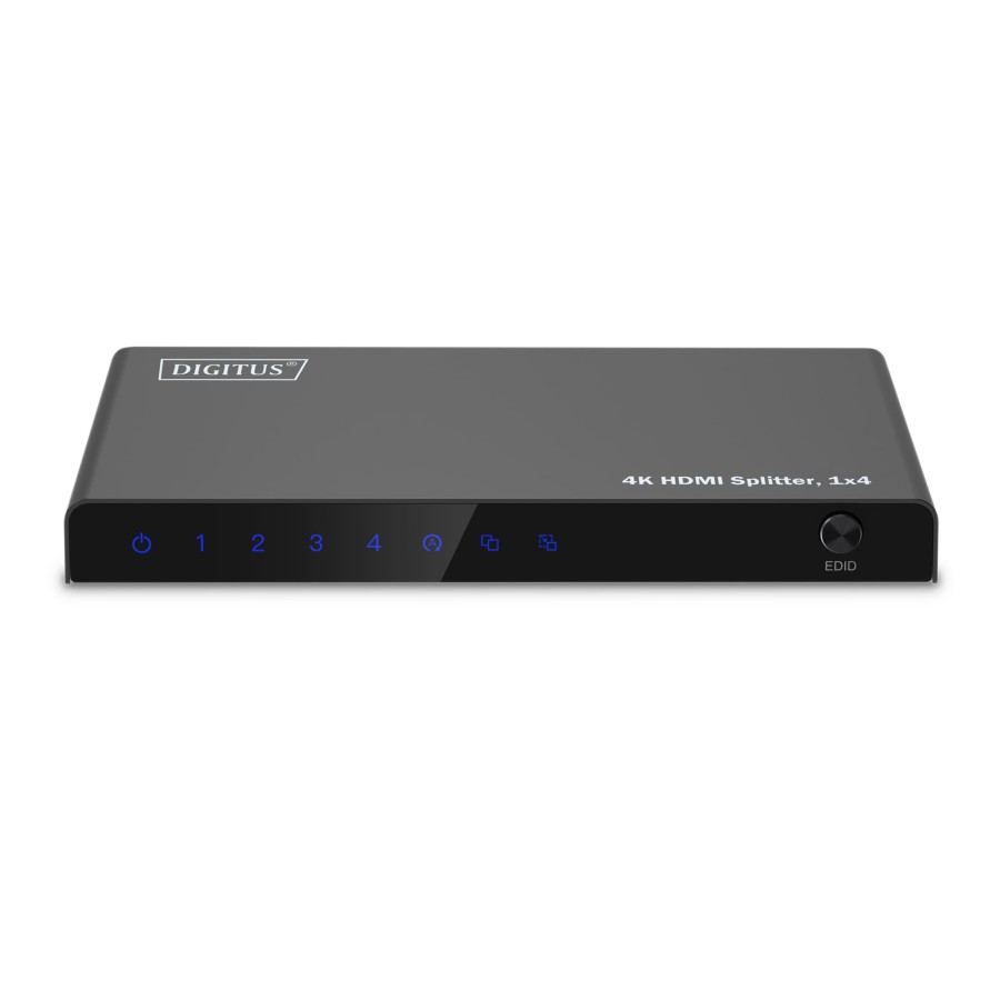 Відеосплітер DIGITUS HDMI розподіляє сигнал з одного HDMI-пристрою на чотири телевізори, монітори або проєктори без втрати якості зображення. Він підтримує стандарт HDMI 2.0 та забезпечує передачу відео з роздільною здатністю до 3840 × 2160 пікселів при частоті 60 Гц і пропускною здатністю до 18 Гбіт/с.
