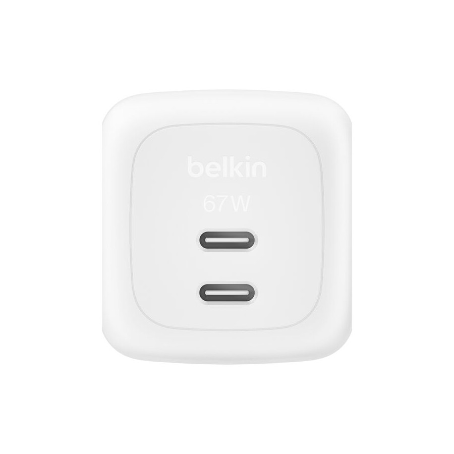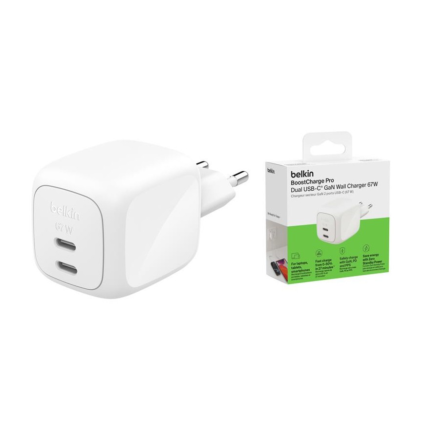 Загальна вихідна потужність становить 67 Вт. Два порти USB-C забезпечують паралельне заряджання смартфона та планшета або ноутбука. GaN зменшує тепловиділення під час роботи та підвищує ефективність. Реалізовано автоматичне налаштування параметрів живлення залежно від під’єднаних пристроїв. Компактний корпус зручний для транспортування. Конструкція надійно фіксується в розетці. Передбачено багаторівневий електрозахист від перевантажень і перегріву. Нульове споживання енергії в режимі очікування зменшує втрати електроенергії.