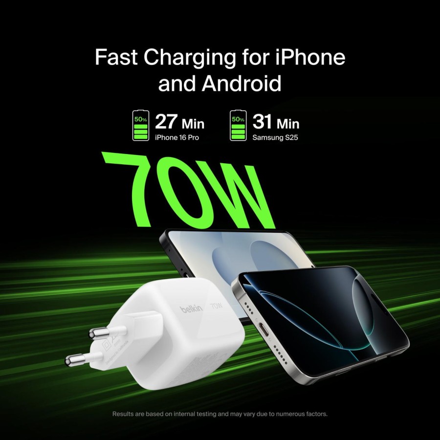 Зарядний пристрій Belkin 70Вт поєднує потужність, компактність і безпечне використання. Він дозволяє ефективно заряджати різні пристрої без перегріву і надлишкових витрат енергії, адаптуючись під конкретні потреби та стандарти розеток.