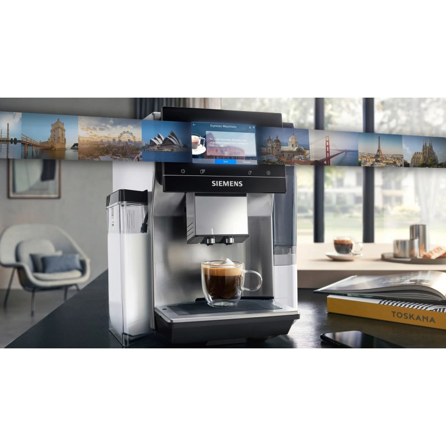 Функція Siemens coffeeWorld надає доступ до міжнародних рецептів кави з різних країн. Напої готуються автоматично з урахуванням заданих параметрів, включно з об’ємом, міцністю та ароматом. Система aromaSelect дозволяє обрати один із трьох профілів аромату відповідно до індивідуальних налаштувань.