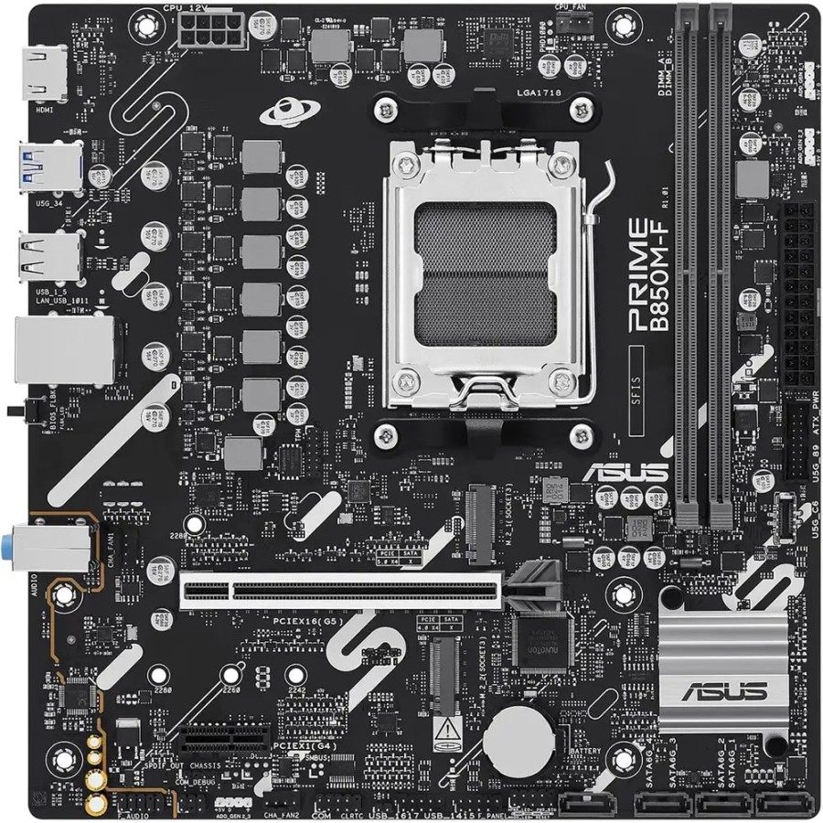ASUS PRIME B850M-F побудована на чипсеті AMD B850 і підтримує процесори AMD Ryzen з теплопакетом до 120 Вт. Два слоти DDR5 дозволяють встановити до 128 ГБ памʼяті з високими робочими частотами залежно від серії процесора. Для накопичувачів передбачено два роз’єми M.2, включно з підтримкою PCIe 5.0, а також чотири порти SATA. Слот PCIe 5.0 x16 забезпечує сумісність із сучасними відеокартами. Реалізовано базові можливості мережевого та мультимедійного підключення.