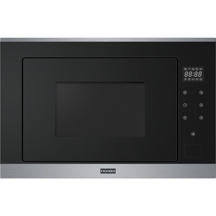 Franke 131.0627.471 — вбудована мікрохвильова піч об’ємом 25 л з потужністю НВЧ 900 Вт і грилем 1000 Вт. Має сенсорне керування, 8 автоматичних програм, функції розморожування за масою або часом, комбіновані режими. Підходить для вбудовування в кухонний гарнітур і щоденного використання. Зовнішнє оформлення — чорне скло + нержавіюча сталь.
