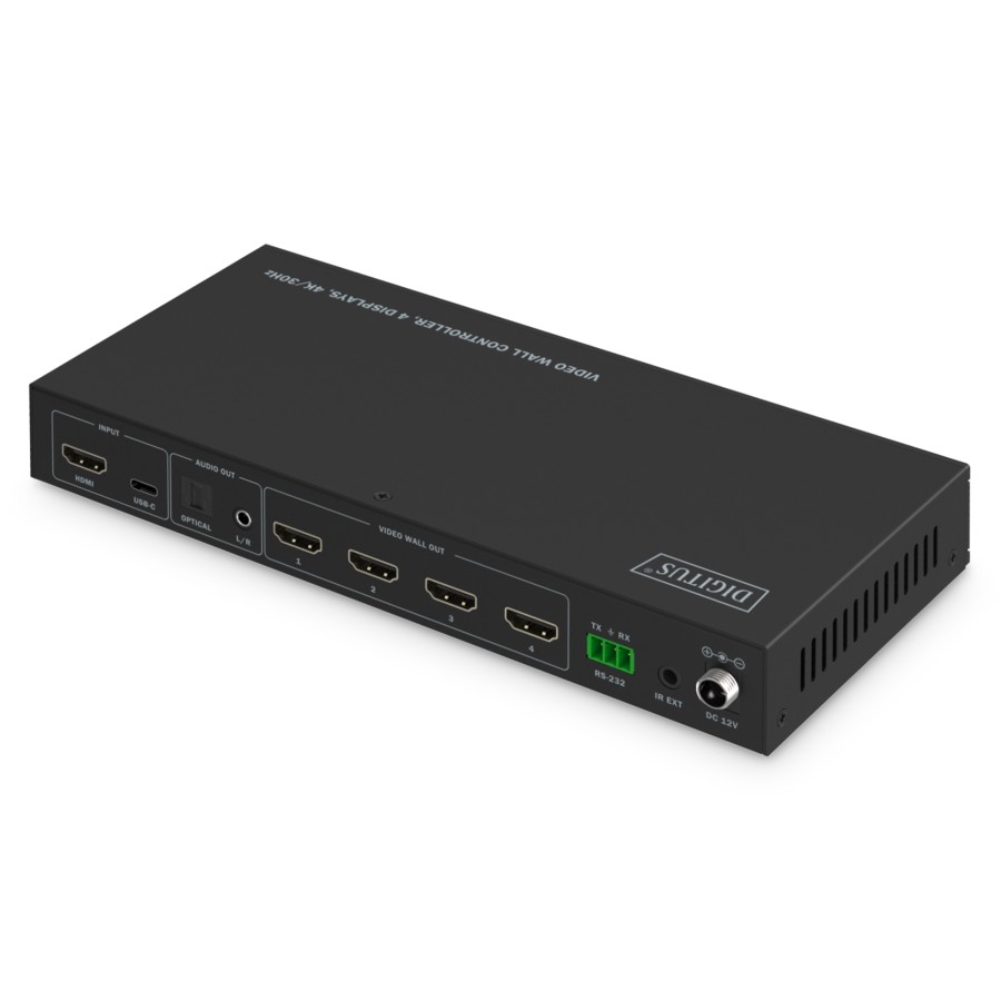 Контролер DIGITUS DS-55358 дозволяє формувати відеостіну з чотирьох дисплеїв у восьми різних схемах розташування, включно з 2x2, лінійними та одиночними режимами. Вхідний сигнал приймається через HDMI 2.0 або USB-C з підтримкою 4K/60 Гц, тоді як вихідні порти формують зображення в режимі 4K/30 Гц.