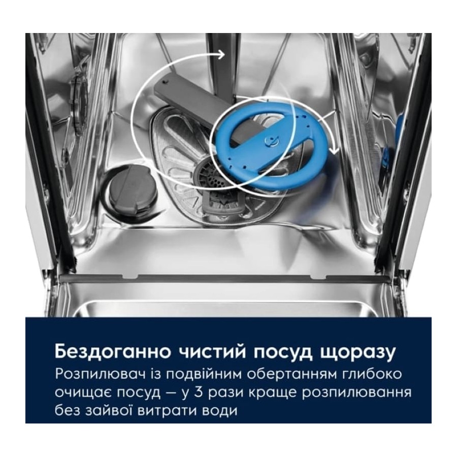 Посудомийна машина Electrolux розроблена для якісного очищення посуду з урахуванням різних типів завантаження. Система SatelliteClean працює за рахунок розпилювача з подвійним обертанням, який змінює кут подачі води, що допомагає ретельно очищати посуд у всьому об’ємі камери, включно з великими предметами.