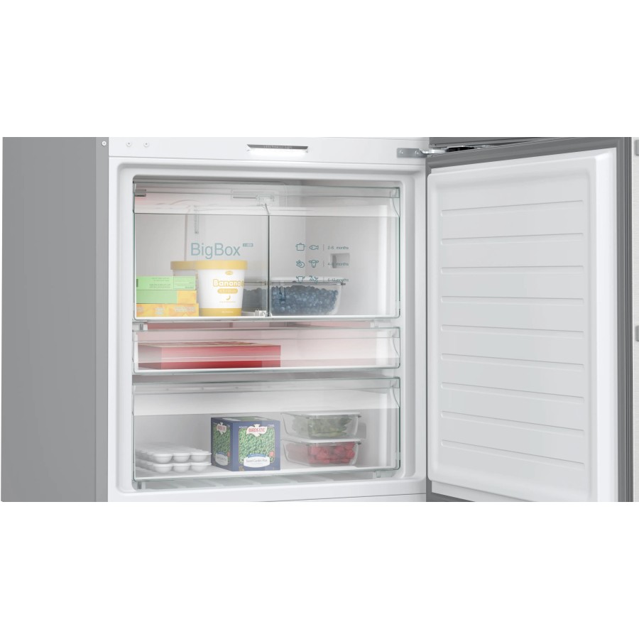 Морозильна камера обладнана системою varioZone зі знімними контейнерами та полицями, що дозволяє адаптувати простір під великі продукти. Контейнер BigBox призначений для зберігання об’ємних упаковок або великих заморожених продуктів.
