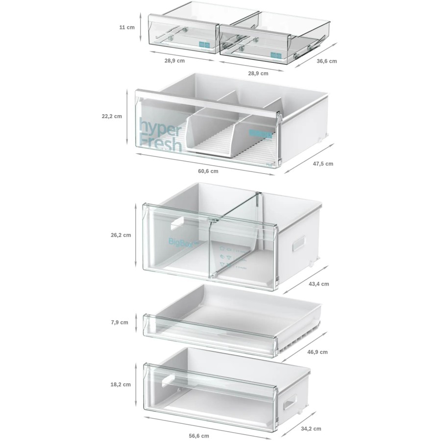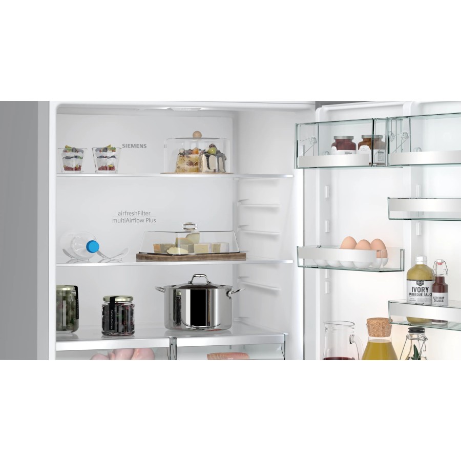 Зона hyperFresh plus дозволяє регулювати рівень вологості у спеціальному контейнері. Це сприяє довшому збереженню овочів і фруктів, їх текстури та поживних властивостей. Система multiAirflow забезпечує рівномірний розподіл холодного повітря по всьому внутрішньому простору та зменшує температурні перепади після відкривання дверцят.