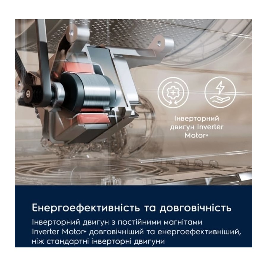 Інверторний двигун Inverter Motor+ працює на основі постійних магнітів і забезпечує стабільну роботу з підвищеною енергоефективністю. Функція Time Manager® дозволяє скорочувати тривалість програм у кілька етапів, а програма Rapid виконує швидке прання невеликого завантаження за короткий час. Для безпеки передбачені контроль рівня води та захист від переливання.