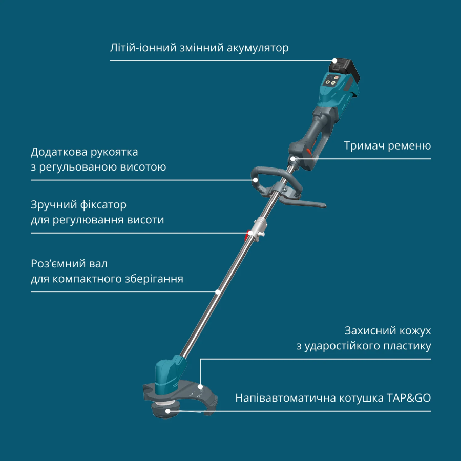 Регульована по висоті рукоятка та плечовий ремінь з м'якою вставкою забезпечують зручність використання та транспортування, а також не вимагають складного технічного обслуговування завдяки відсутності необхідності в паливних сумішах та фільтрах.