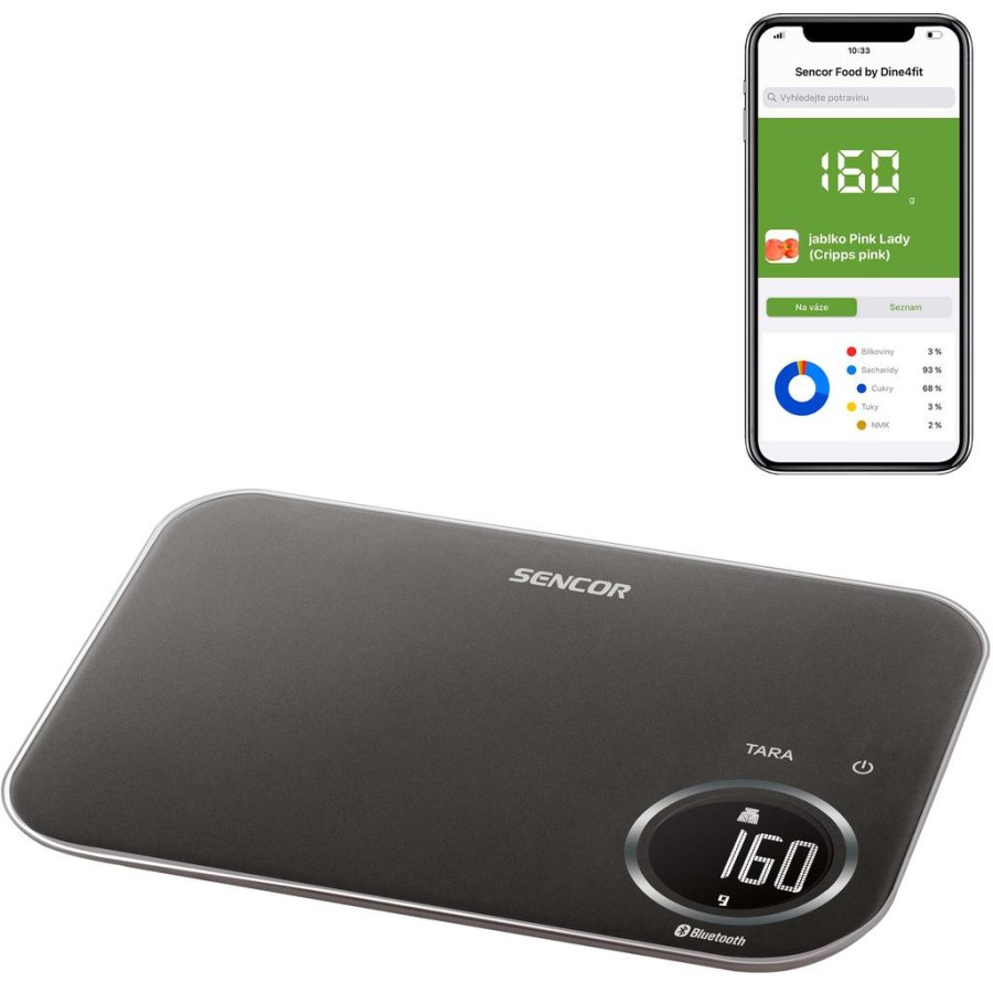 Ваги зважують до 8 кг із точністю 1 г — достатньо для будь-яких рецептів від дрібних спецій до великих порцій. Bluetooth-з'єднання зі смартфоном на iOS або Android відбувається автоматично після запуску застосунку без ручного налаштування. Застосунок Sencor FOOD, розроблений разом зі створювачами Calorie Tables / Dine4Fit, містить понад 400 000 постійно оновлюваних продуктів із даними про вуглеводи, білки, жири, холестерин, клітковину та калорійність. Сканування штрих-коду EAN на упаковці миттєво ідентифікує продукт у базі даних. Два режими застосунку — «На вагах» для поточного зважування та «Список» для сукупного підрахунку кількох інгредієнтів — охоплюють як швидке зважування, так і приготування за рецептом. Функція TARA зберігає вагу попередніх інгредієнтів у пам'яті та скидає дисплей до нуля, щоб зважувати наступний компонент без зняття ємності. Білий РК-дисплей з підсвічуванням чітко читається в будь-яких умовах освітлення.