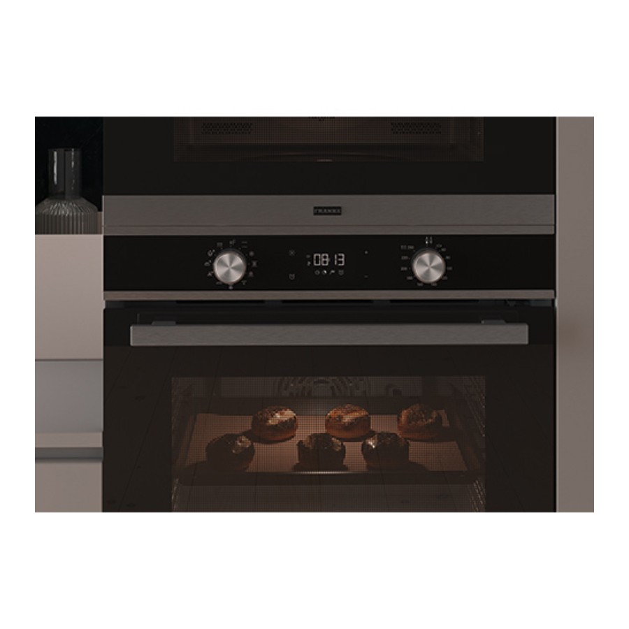 Вбудована електрична духова шафа Franke Smart FSM 97 P XS – флагманська модель преміум-класу, що поєднує передові технології приготування, автоматичне піролітичне очищення та вишуканий дизайн. Стильне поєднання чорного скляного фасаду з елементами з нержавіючої сталі створює сучасний та елегантний вигляд, який ідеально впишеться в кухню будь-якого стилю – від мінімалізму до класики. Корисний об'єм 71 літр робить духовку оптимальним вибором для сімей, які люблять готувати великі порції, приймати гостей або пекти кілька страв одночасно. Дев'ять режимів роботи охоплюють весь спектр кулінарних завдань: від класичного верхнього та нижнього нагріву до спеціалізованих програм для випічки хліба, приготування десертів, піци та об'ємних страв типу індички або великих шматків м'яса. Автоматичні програми для хліба та десертів самостійно підбирають оптимальну температуру та час приготування, гарантуючи ідеальний результат навіть початківцям. Потужність 3300 Вт забезпечує швидкий розігрів та ефективне приготування, а енергоклас A+ гарантує економічну експлуатацію.
