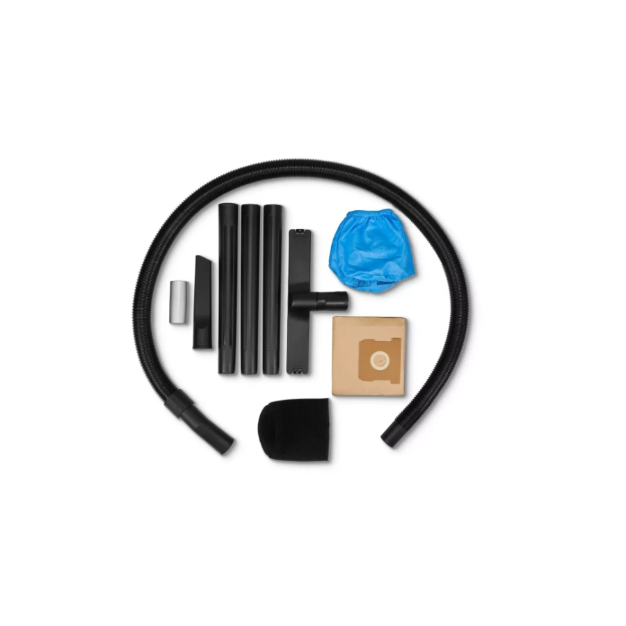 Бак із нержавіючої сталі об’ємом 15 літрів стійкий до механічних впливів і контакту з вологою. Пластиковий всмоктувальний шланг довжиною 1,5 м (Ø 36 мм) у поєднанні з трисекційною трубкою формує робочий радіус до 4 м завдяки кабелю живлення довжиною 2,5 м. Для зберігання кабель намотується на корпус.