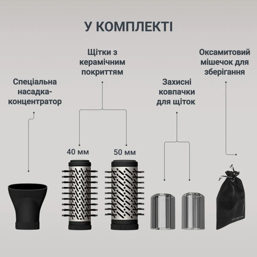 - Комплектація: фен-щітка, концентратор, 2 щітки (40 мм, 50 мм), захисні ковпачки, оксамитовий мішечок