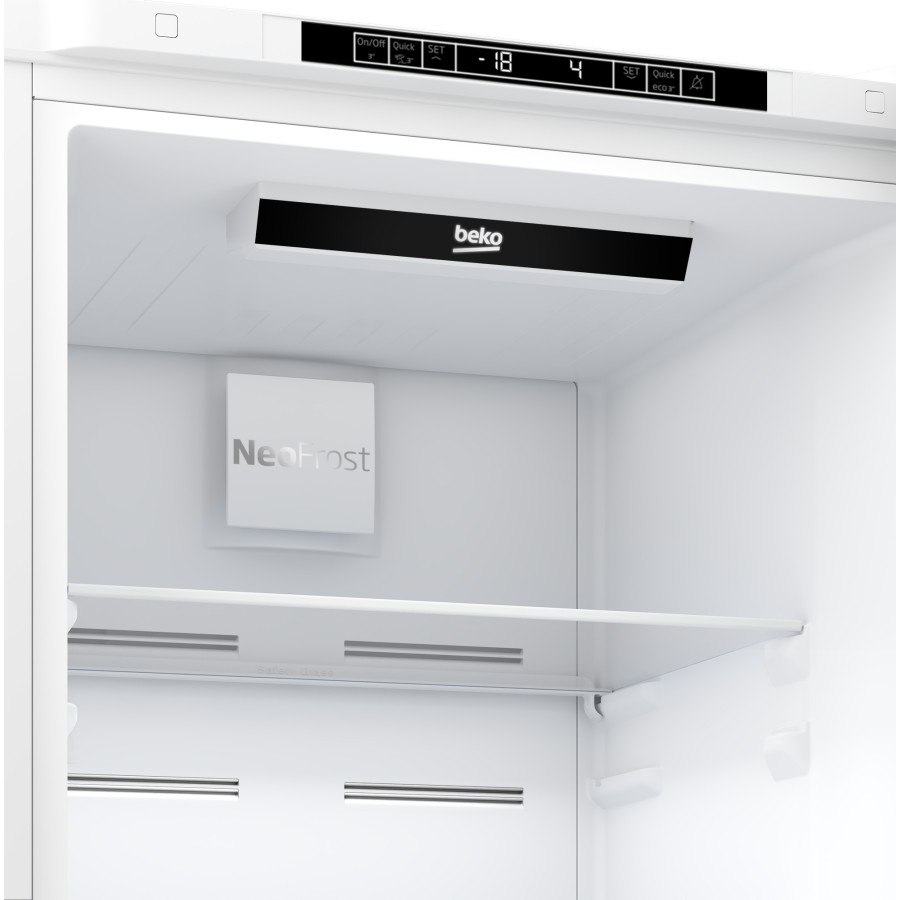 Beko RCNA406I40WN — двокамерний холодильник із нижньою морозильною камерою, призначений для щоденного зберігання продуктів у родинному просторі. Габарити 202,5 × 59,5 × 67 см відповідають стандартним кухонним нішам.