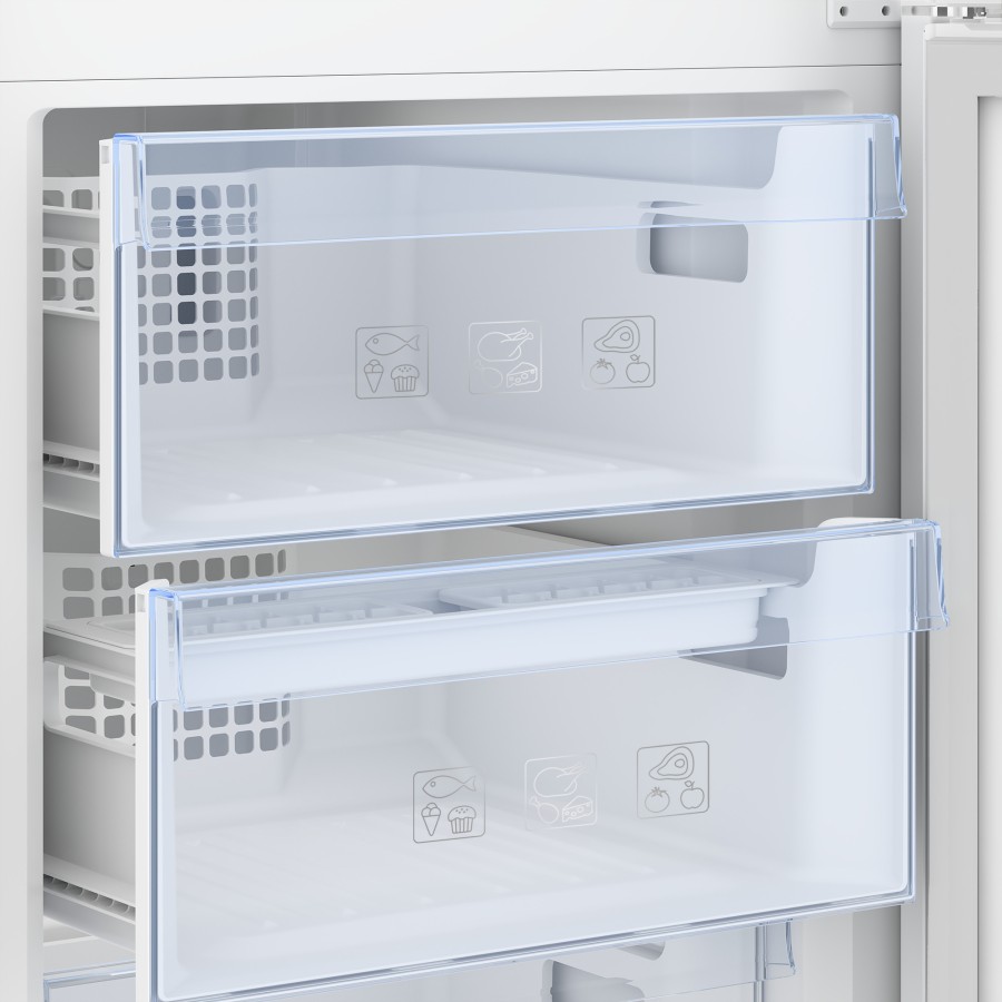 Внутрішній простір організований із чотирма скляними полицями із загартованого скла, місткою шухлядою для овочів та трьома ящиками морозильної камери. LED-освітлення рівномірно підсвічує камеру.