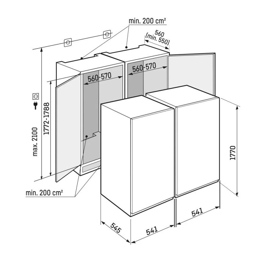 Вбудований холодильник Liebherr IXRFS 5125 22 Plus Side-by-Side інтегрується в кухонні меблі з нішею висотою 177,2–178,8 см, шириною 56–57 см та глибиною 55 см. Загальний об'єм 500 літрів розподіляється між холодильним відділенням 195 л, зоною BioFresh 96 л та морозильним відділенням 209 л, що дозволяє організувати зберігання великої кількості продуктів. Динамічне охолодження в обох камерах разом з автоматичним розморожуванням усуває появу інею.