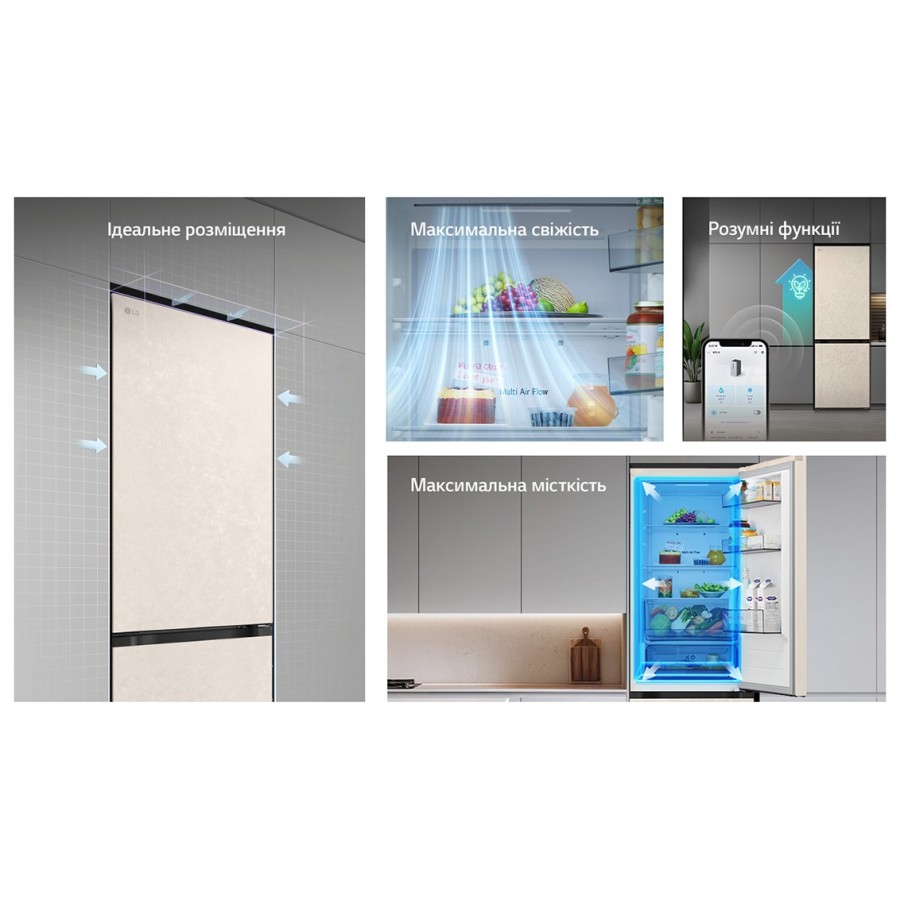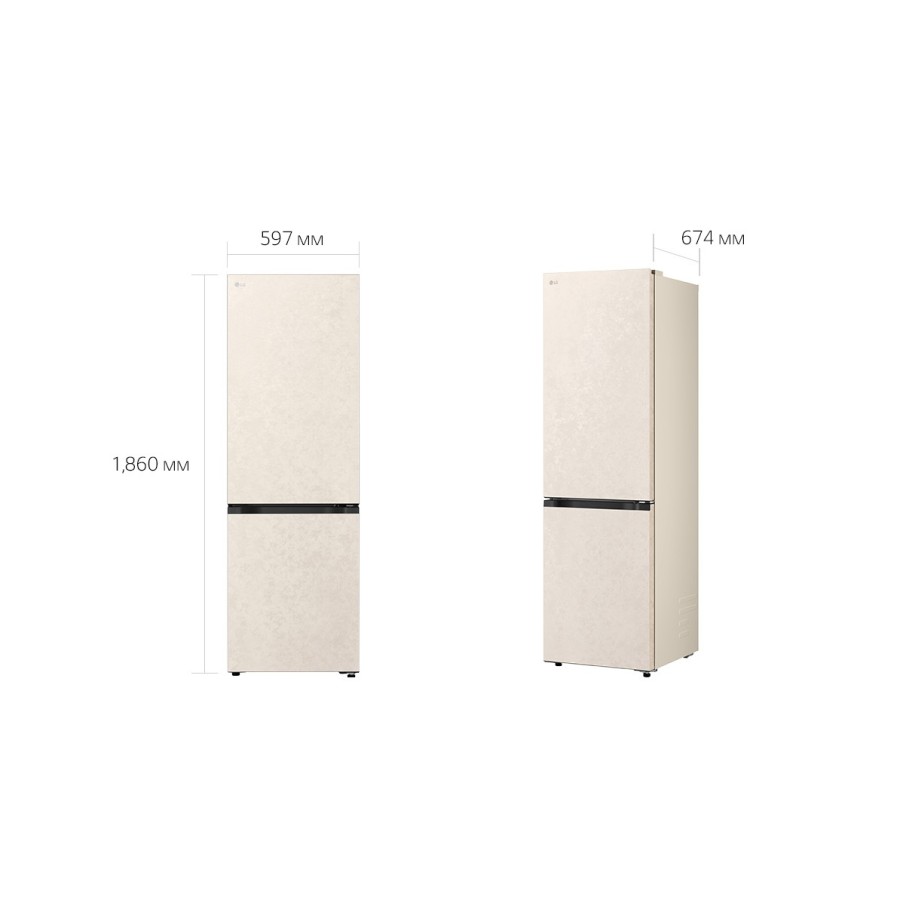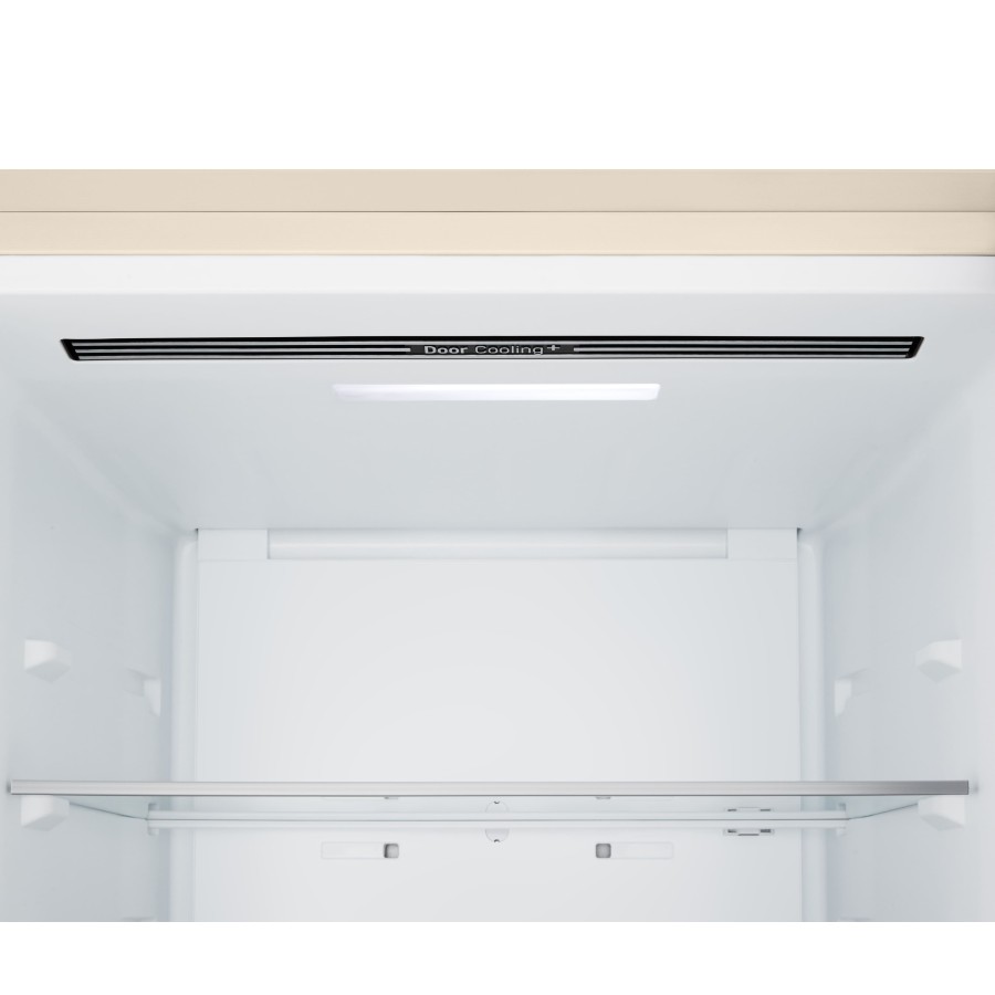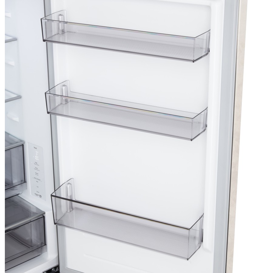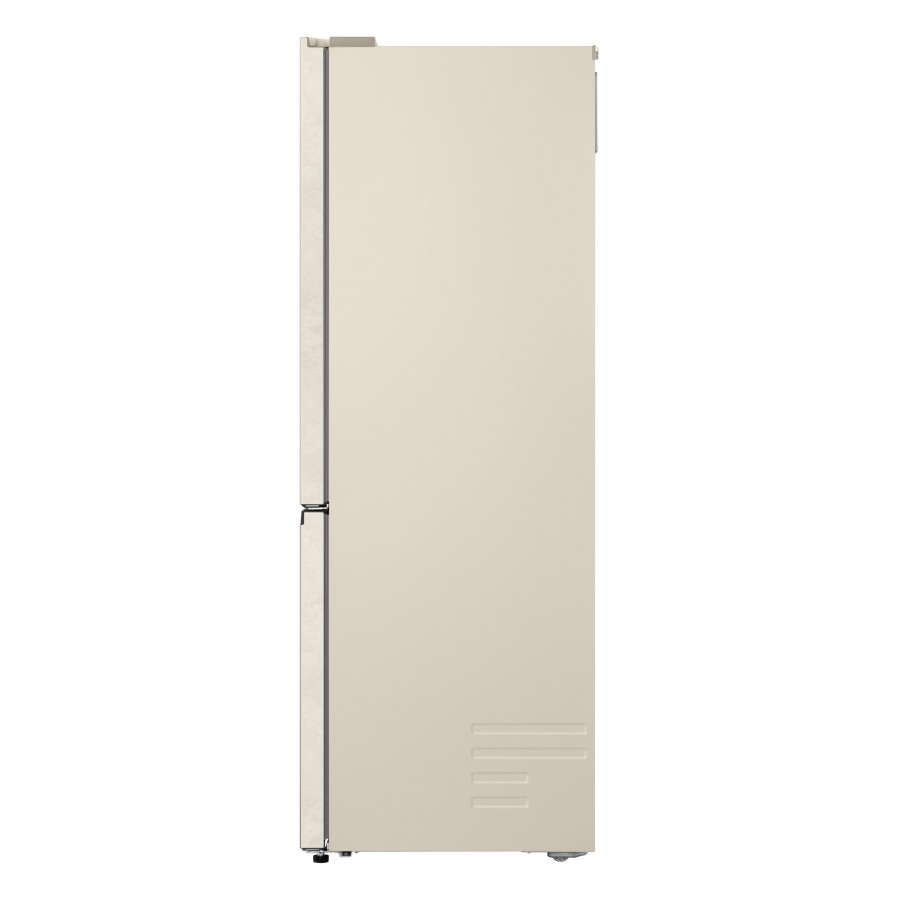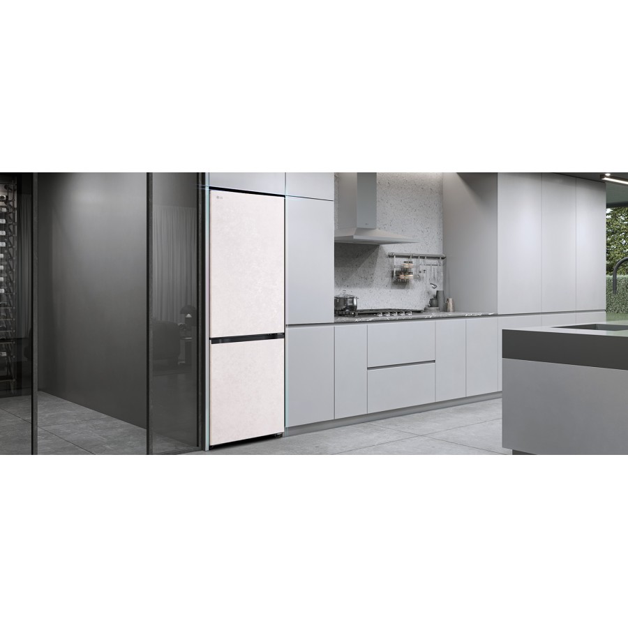 Холодильник LG GC-B459EEYM у бежевому кольорі з прихованими горизонтальними ручками створює стриманий і сучасний вигляд, що пасує до кухонь у нейтральних тонах. Нульовий зазор дозволяє розмістити його впритул до стіни чи шаф, а можливість перевесити дверцята адаптує прилад під будь-яке планування. Внутрішній LED-дисплей розташований зручно для швидкого контролю налаштувань без зайвого освітлення зовнішньої панелі.