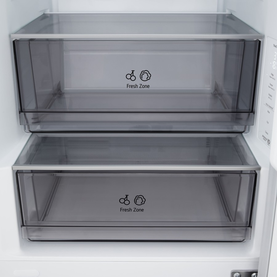 Система охолодження Total No Frost запобігає накопиченню льоду на стінках і продуктах, а багатопотокова Multi Air Flow рівномірно охолоджує всі рівні. DoorCooling+ спрямовує холодне повітря безпосередньо до дверей, де часто зберігаються напої та соуси, забезпечуючи швидке відновлення температури після відкривання. Зона свіжості Fresh Zone підтримує підвищену вологість для м’яса, риби та овочів, подовжуючи їхню придатність.