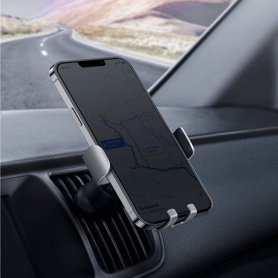 Унікальна поворотна конструкція тримача забезпечує можливість регулювання кута нахилу смартфона за вашим бажанням. Це особливо зручно під час використання навігаційних додатків або перегляду мультимедійного контенту під час поїздок. Міцні фіксувальні бортики гарантують надійне утримання гаджета, а м'які накладки запобігають появі подряпин на його поверхні.