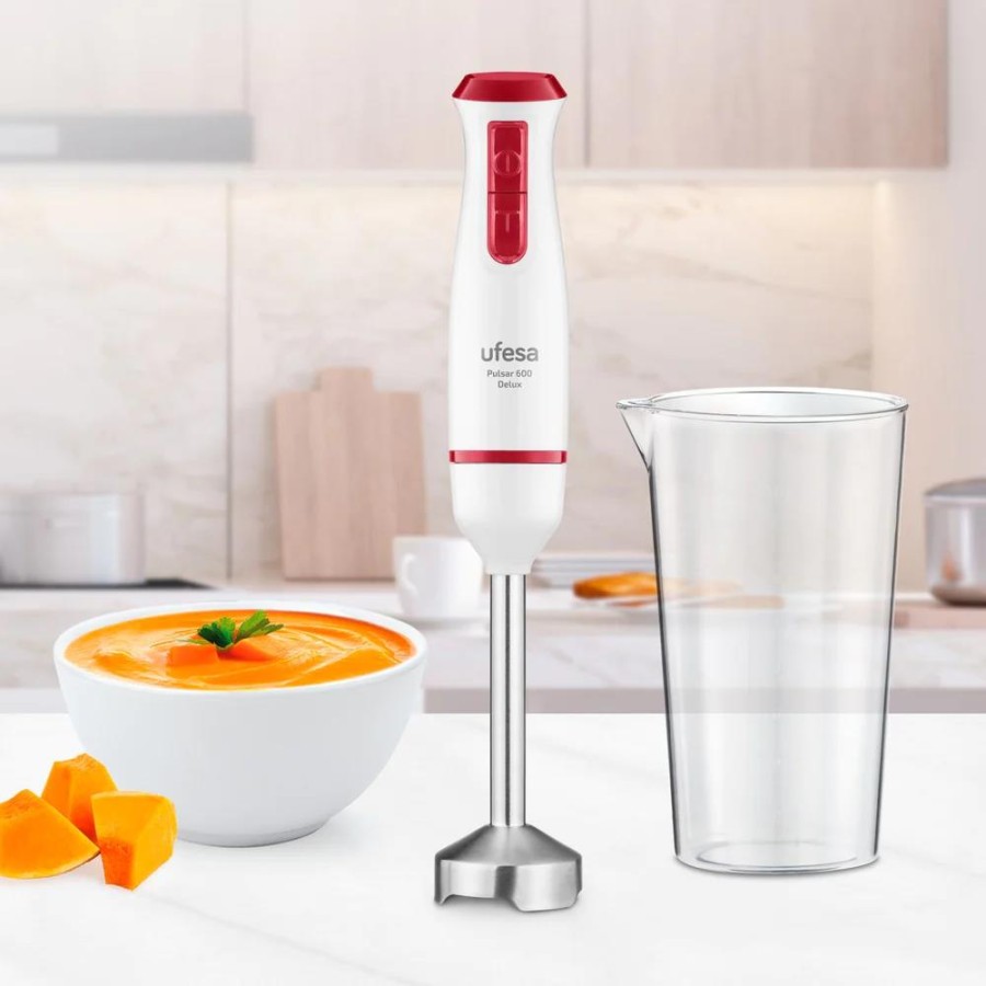 Переваги блендера Ufesa Pulsar Delux: • Функція турбо: для швидкого та потужного подрібнення; • Дві насадки з нержавіючої сталі: для подрібнення (подрібнює горіхи, овочі, фрукти та багато іншого), для збивання (готує пухкі креми, муси та омлети); • Ергономічний дизайн: зручний та безпечний у використанні; • Захист від бризок: залишає вашу кухню у чистоті; • Текстуроване покриття: запобігає ковзанню в руці; • Мірний стакан об'ємом 600 мл без BPA: для точного вимірювання інгредієнтів.