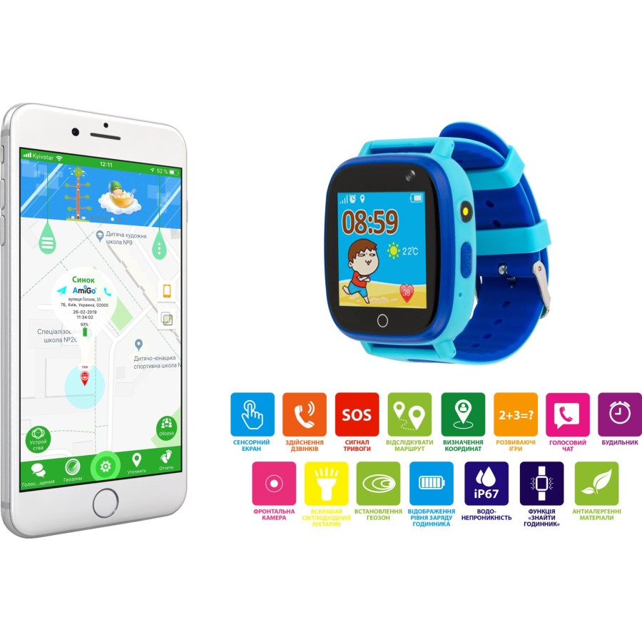 Смарт-годинник AmiGo GO004 Splashproof Camera + LED працюють у форматі «маячок для дітей» і дозволяють батькам завжди проконтролювати де знаходиться їх малюк. Бездротова модель з підтримкою Bluetooth v 4.0 легко синхронізується з мобільним пристроєм і працює на пристойній відстані від нього, дозволяючи отримувати оповіщення про вхідні дзвінки та SMS-повідомлення. Браслет з підтримкою власної micro-SIM дозволяє здійснювати особисті дзвінки, в тому числі і екстрені.