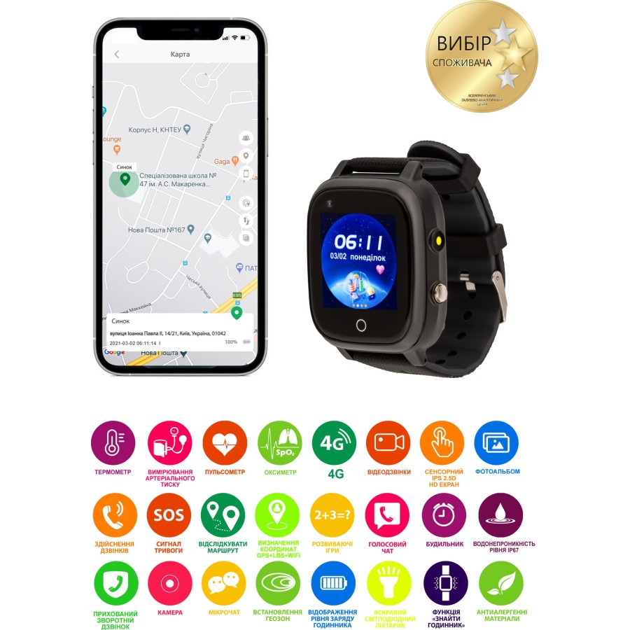 Пульсоксиметр і Тонометр - вбудовані датчики пульсоксиметр і тонометр тіла в годинах, легко виміряють серцевий ритм і рівень насиченості кисню в крові. Ці параметри можна отримати як з годин, так і дистанційно, коли дитина не поруч, натиснувши відповідну іконку в додатку, в вашому смартфоні.