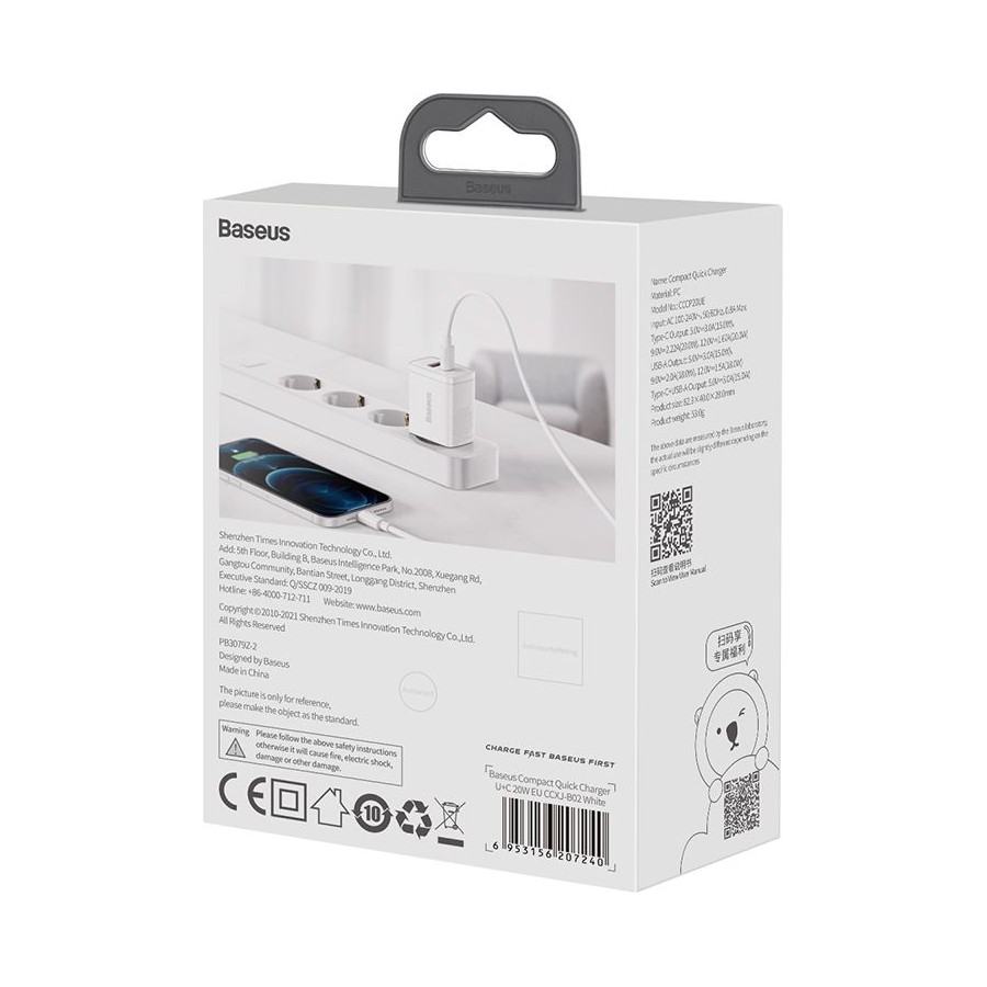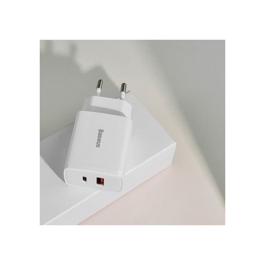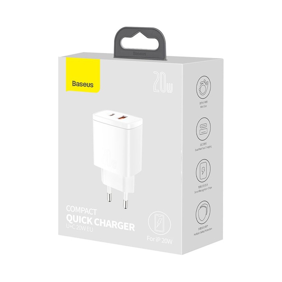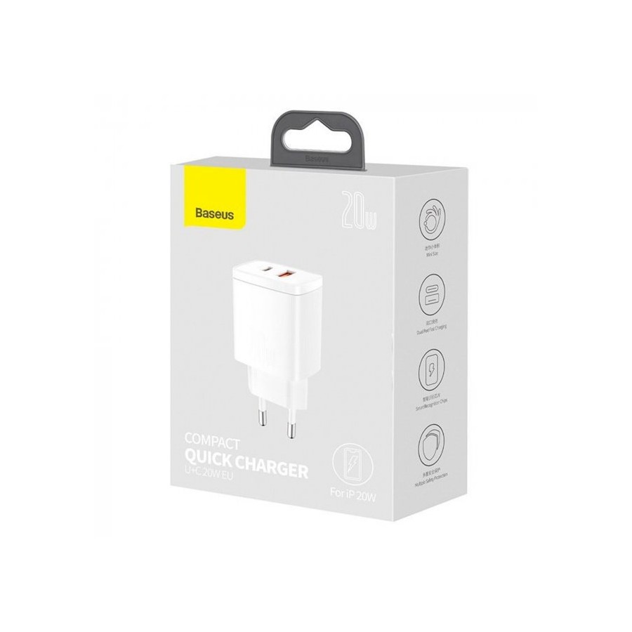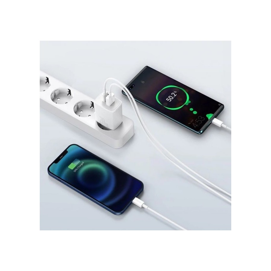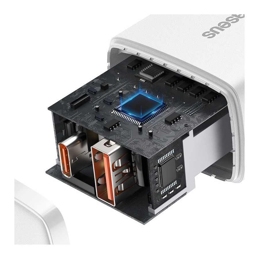 Baseus Wall Charger USB+USB-C 20W - мережний зарядний пристрій, який призначений для зарядки мобільних пристроїв від мережі змінного струму. Поставляється без кабелю. Має гладке покриття корпусу, чим і відрізняється від інших пристроїв. Підтримує швидку зарядку Power Delivery, тому заощадить час на відновлення енергії. Оснащений парою USB портів, тому дозволяє заряджати одразу два гаджети.