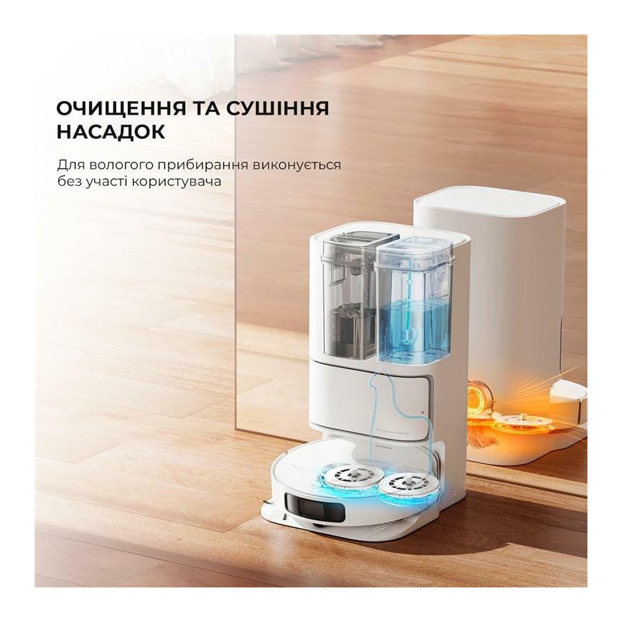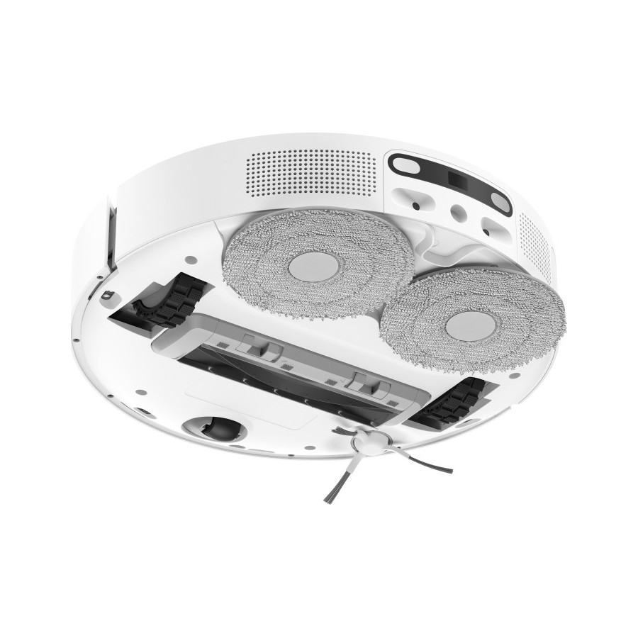 Для вологого прибирання миючий робот пилосос використовує не просто мікрофіброву серветку, а два чистячі колеса з м'якими ворсинками. Під час миття підлоги вони обертаються і якісно видаляють з поверхонь пил, побутові забруднення та засохлі плями.