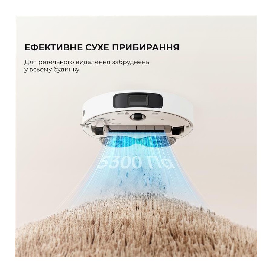 Потужний двигун Xiaomi Dreame Bot L10 Ultra забезпечує силу всмоктування 5300 Па, завдяки чому робот якісно очищує будь-які тверді покриття, килими та ковролін. При заїзді на килими гаджет автоматично збільшує потужність всмоктування до максимального рівня: це допомагає очистити килими не тільки від пилу, а й упоратися з волоссям та шерстю домашніх тварин.