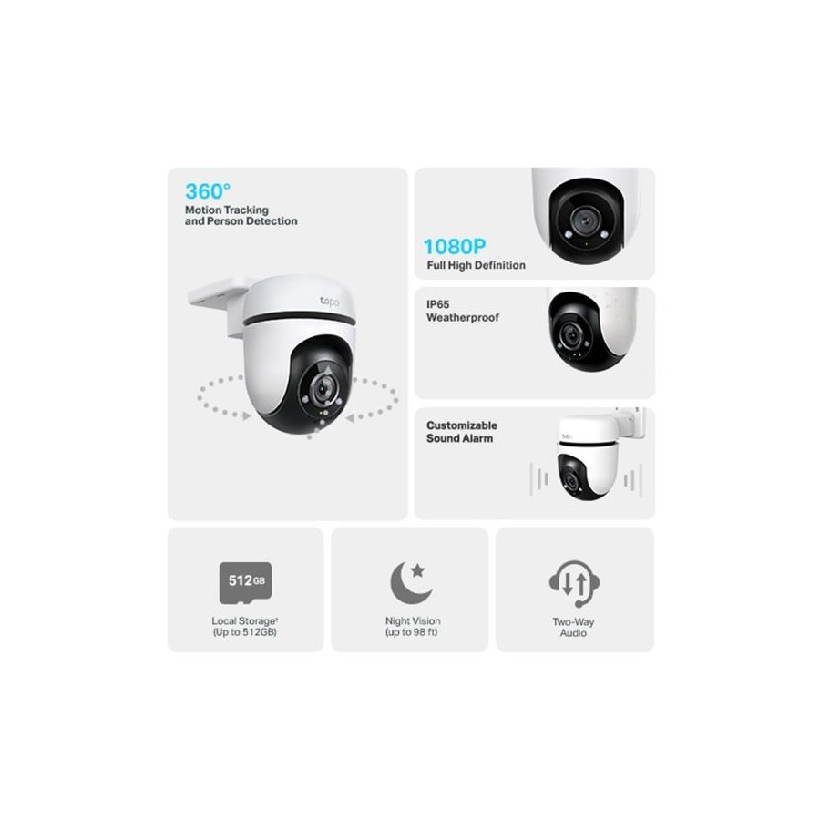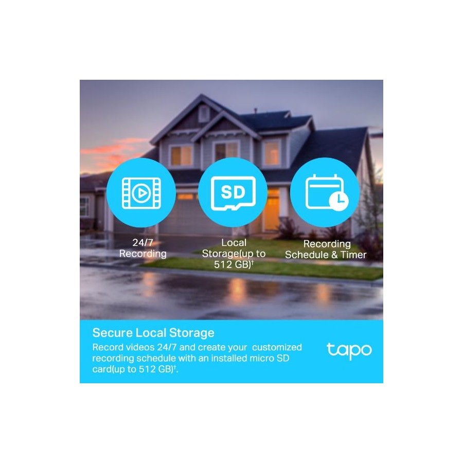 • Flexible Storage Choices-Save recorded videos to an installed microSD card(up to 512 GB)†, or use Tapo Care** cloud storage service.